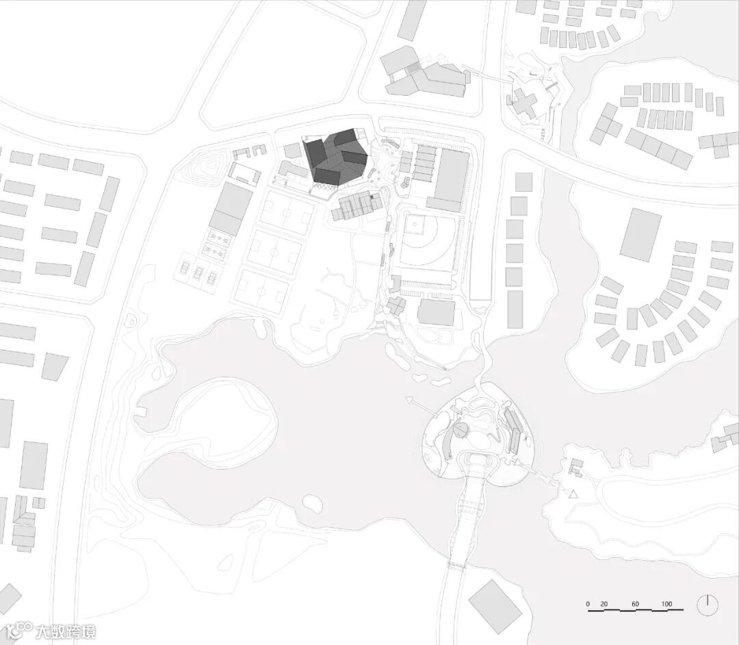 项目位于麓湖生态城西北方向,与热闹的麓坊中心一路之隔。场地周边地块功能围绕着运动与休闲展开,运动公园、体育中心、露营体验区、商业街区无一不在提示着我们关于这片区域的动感与活力。而实际上,这片区域的“动感”程度的确比我们想象中要迅猛:从设计伊始到施工建设阶段,哪怕直到建成后的今天,项目的周边环境竟然一直处于变化之中。建筑一定要适应周边所有的场地环境吗?在不停变化的周遭里,兀自立起似乎岿然不动的建筑,或许以不变应万变也是一个答案。