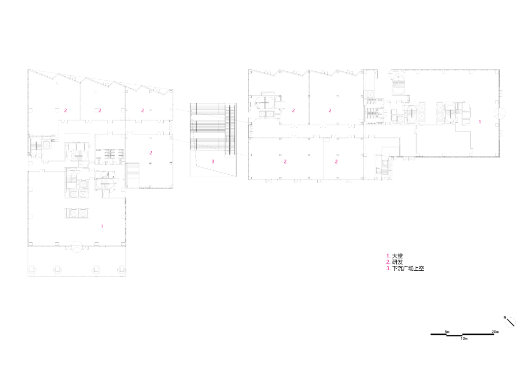 作为新生活方式的承载体,文体休闲中心和户外餐吧设立于底层配套商业的屋顶花园中,促进人与人之间“创新可见”的交流合作。于此漫步,一个向内退进的折角空间形成指向地下空间,一条亮黄色色带蜿蜒而下吸引人群。到了下沉式庭院,这里是提供餐饮等不同需求的配套。室外元素及绿植引入到室内,模糊了室内外空间界限,一改地下空间的局促为轻松休闲。