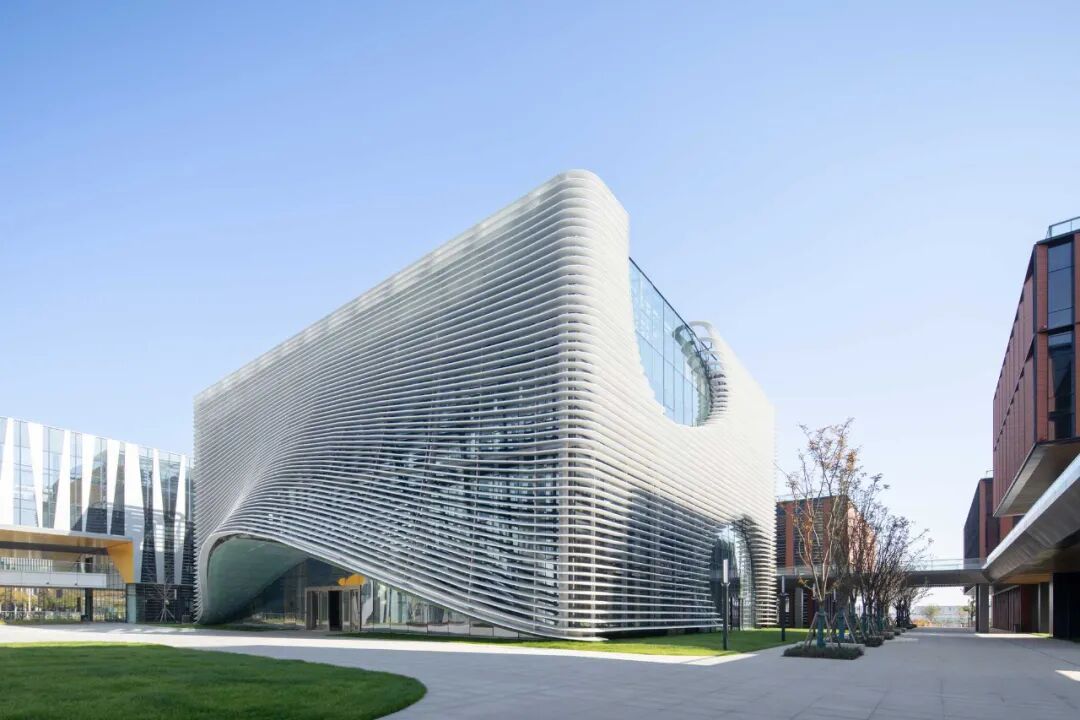 展示中心位于创新社区的核心位置,波动的曲线立面形成视觉焦点,与中心广场一起成为整个社区的“引力场”,灵活满足展览、音乐会、舞台演出或大型集会等不同使用需求。