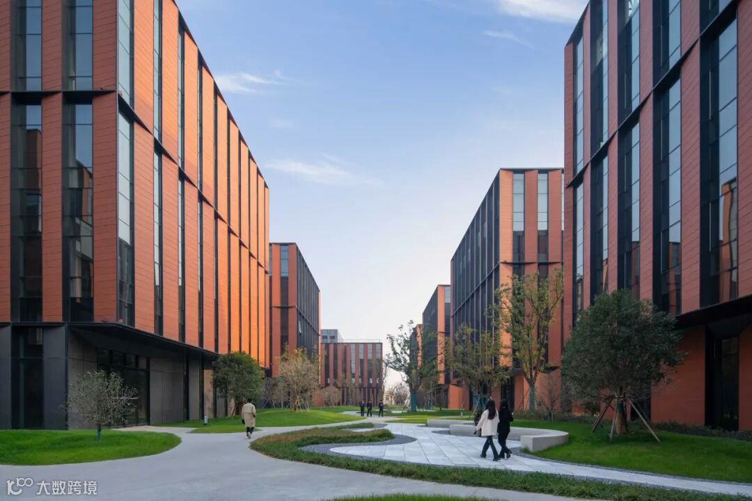 满足不同使用人群对空间的感知和诉求,创新社区内部以鲜明性格的建筑代替了兵营式产业园区的单调。暖色调的多层建筑集群被草地、小径、水面包围。阳光之中,红色陶板上诉说着这里的代名词:温暖。