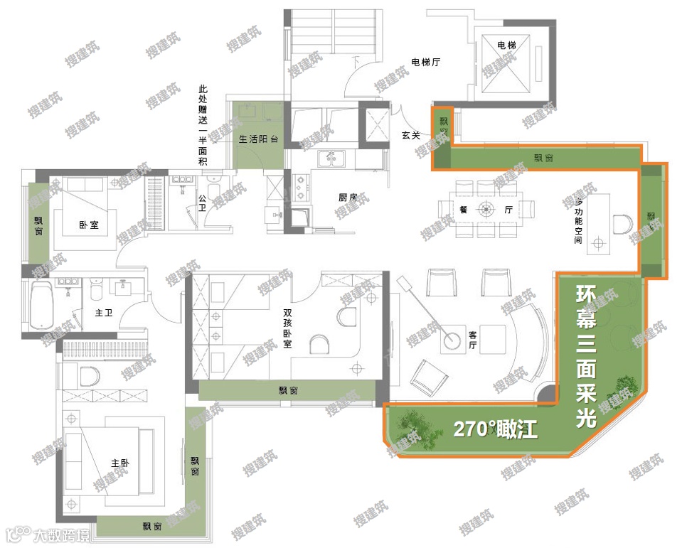 公区实现了超强大的三面采光,环幕大面积采光,打破空间界限,实现270°瞰江。餐厅超大飘窗与客厅观景阳台实现南北对流,让整个公共空间清爽明亮。