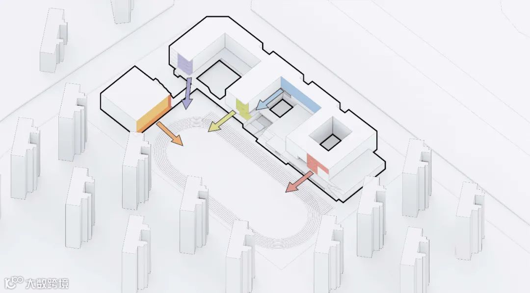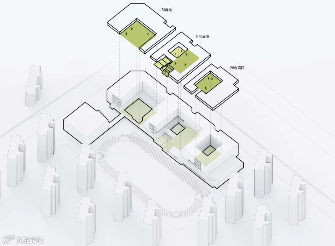 我们在教室围合出的空间创造出了三种不同类型的院子,利用“第二跑道”分别与露台,连廊,台阶和架空的巧妙组合,从而形成了U型庭院,下沉庭院和四合庭院。