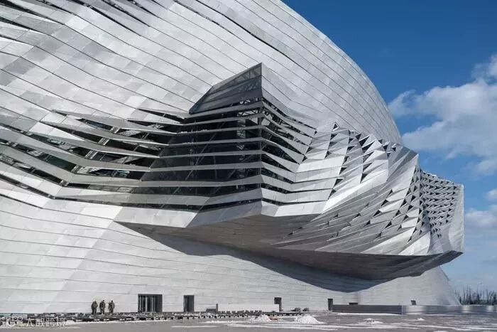 哈尔滨歌剧院的外观,这座建筑表达了周围地区蜿蜒的景观。其弯曲的表面由柔和的白色铝板构成,成为了一部由边角和表面,柔软和锐利构成的诗篇。