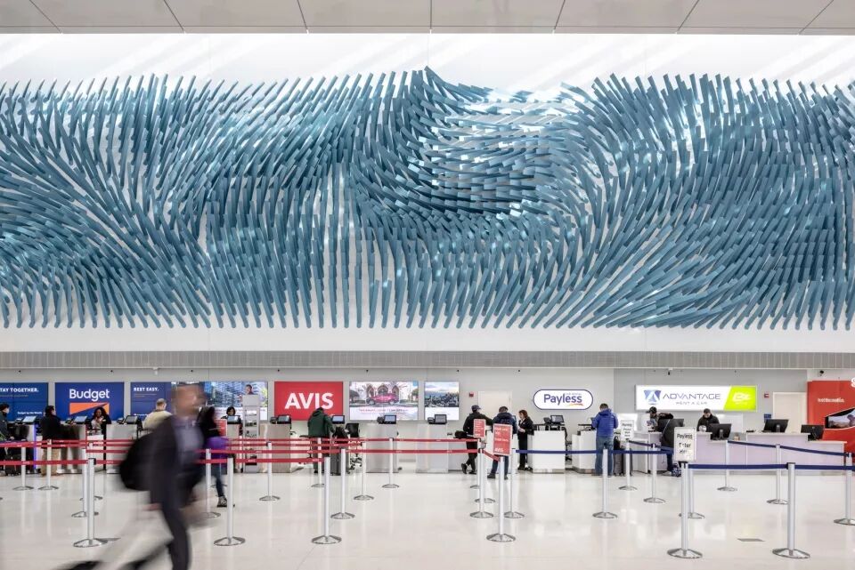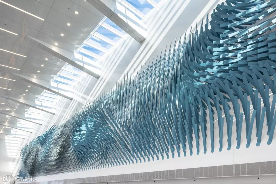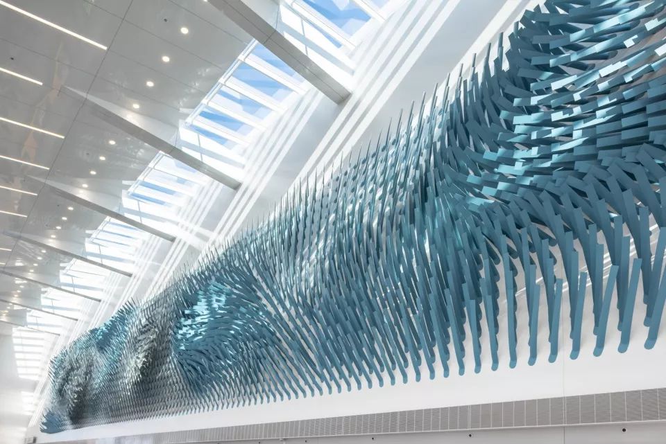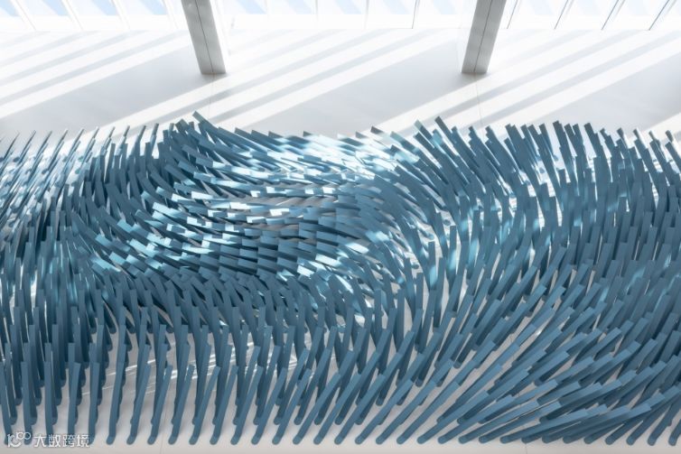 雕塑装置电场线 Field Lines,这座大型雕塑位于新扩建的奥黑尔机场交通枢纽,意为一个动态气流的代表,在稳定和湍流的风条件下振荡。
