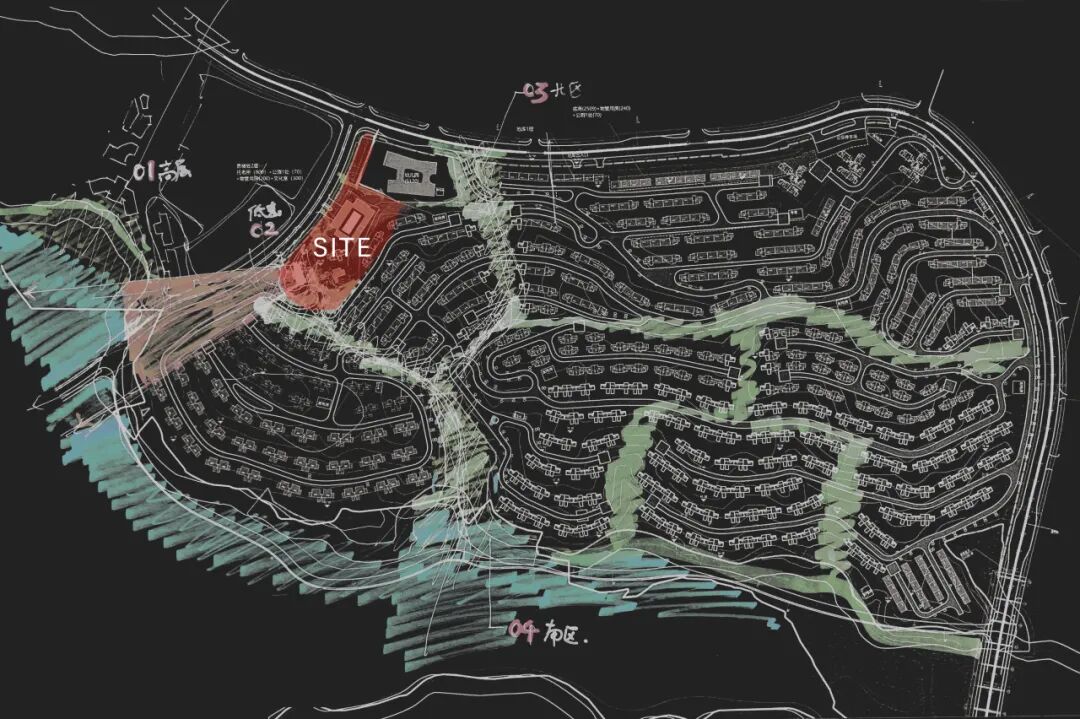 金地御湖颂美术馆 位居增城区永宁片区,属于广州市中心与增城区之间。南侧有一千四百亩的荔湖。北侧是妃子湖,可通至新新大道,道路通达性很好。场地以一座山的形态盘踞在双湖之间,形成了一个藏风纳气、山湖相依的格局。场地内部有一定的高差,自然资源丰富,如何将人类居住场所与现有的自然环境相融合,在空间和感知上与自然产生链接,是我们在该项目中最大的思考。