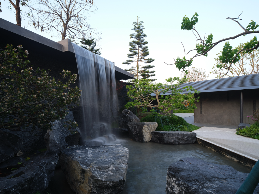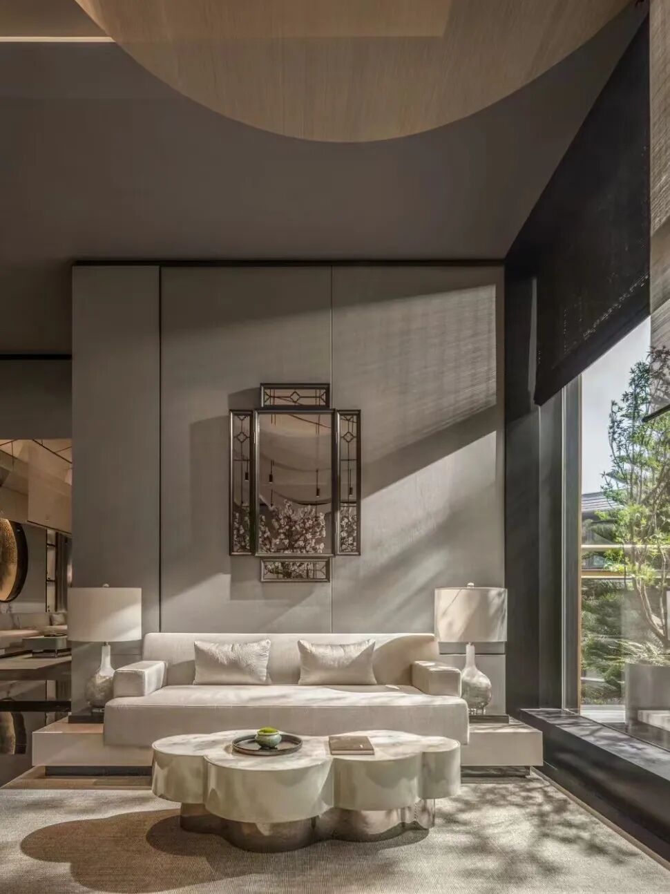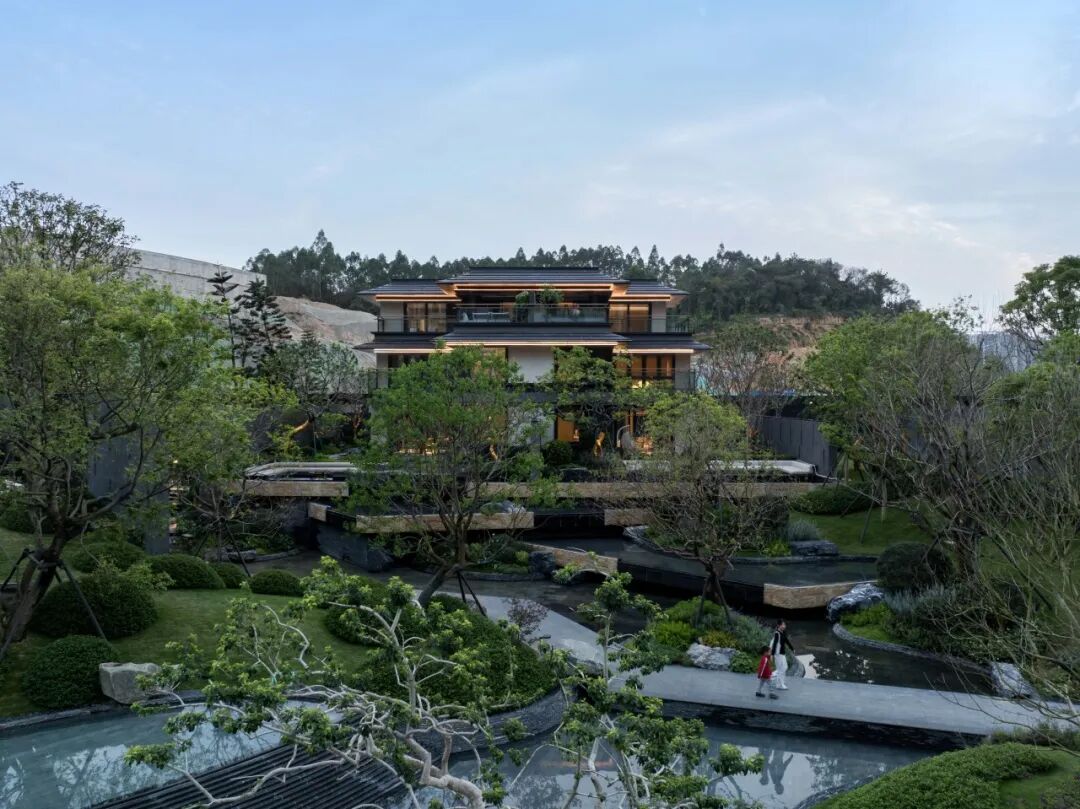 整体设计遵循四个特征,1.生活场景:山水雅集生活;2.建筑形式:线性水平之美;3.空间布局:流动掩映之美;4.部品语言:简精极致之美;一种由奢入简的返璞,舒适安逸,让居者回归生活本真。