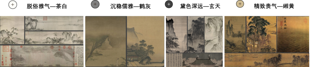整体色彩以淡雅为主色调,借鉴了宋画里茶白、鹤灰、玄天、缃黄这几个雅致,又有层次感的颜色。