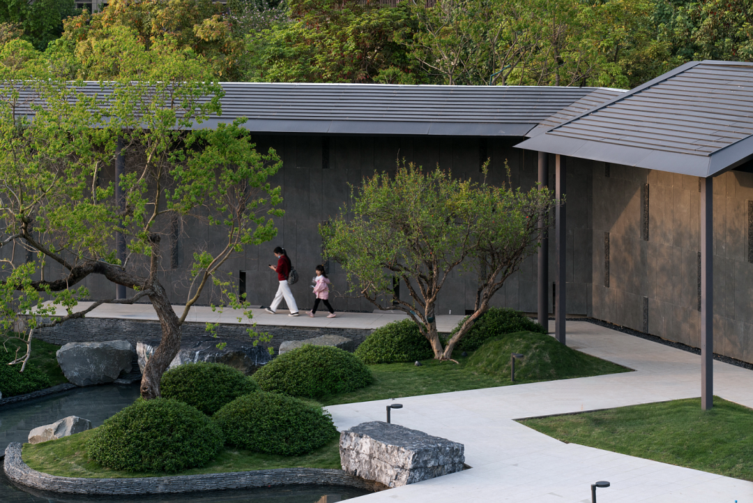 与自然共栖,融于山水的美学馆不是某一栋宋代建筑的复古。建筑空间、室内空间、景观空间、“灰空间”以及檐下空间,承载了现代风雅的生活,打造生活场域氛围,一个供居者可游、可行、可望、可居山水之间的西园雅集图,亦是从物质空间到人文、精神空间的升华。