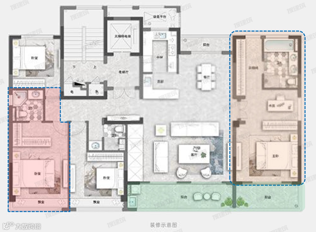 另外全屋飘窗,动静分离,奢华舒适;双套房并且均为南向设计,终极改善豪宅的首选。