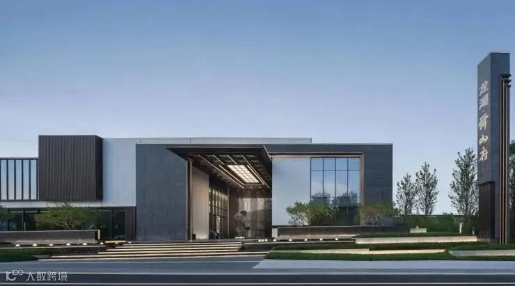 海宁城投绿城水月云庐外立面现代科技与美学的融合设计,以石材、铝板、蓝灰色Low-E玻璃作为主要材料,底层石材,二层及以上为铝板。