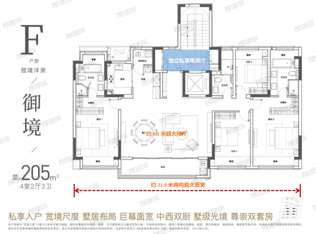 比如建面约205㎡4房2厅3卫户型,私享电梯入户前厅,营造专属领地的私密感与安全感,独立玄关,延展了生活空间的尺度。南向面宽约20米,大横厅有约8.1米的超大尺度,能实现真正的南北对流,通风采光一流。