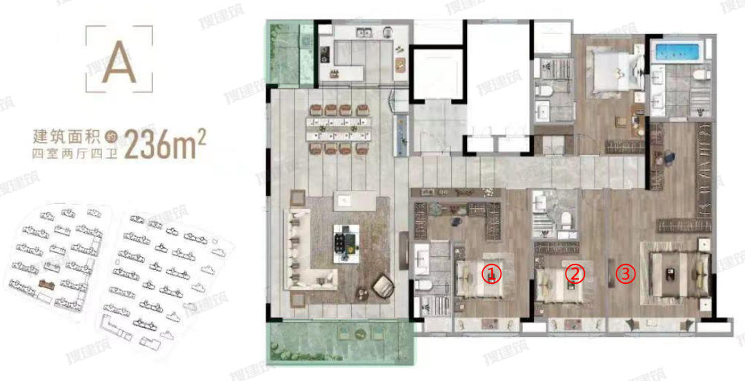 建面约236㎡户型则更为奢阔,总面宽达到约18.7米,约58㎡的270°观景边厅是当下的豪宅标配。同样的四开间朝南设计,南向三卧室均配有飘窗,整体得房率达到约96%。尤其是主卧套间尺寸惊人,完全不输给五星酒店总统套房式的体验。