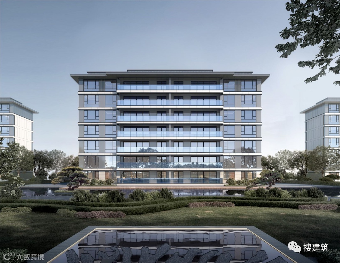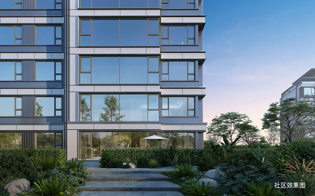 洋房外立面现代简约风格,六重精工体系,局部米白色石材、局部深灰色铝板、深灰色金属漆、米白色真石漆、三玻两腔中空low-e玻璃,配以超高窗墙比,大气美观。