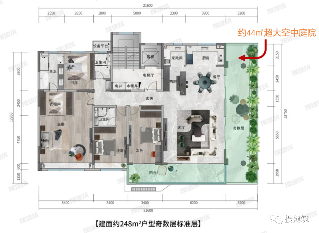 建筑面积约248㎡的户型,将庭院花园搬到了空中,一梯一户,一层一户,空中平墅。奇数层侧面单独赠送了约44㎡超大空中庭院。尤其是半空延展,约6.2m颠覆性的挑高设计,让空间感无限放大,配以全景落地窗,将室外的风景无界消融。