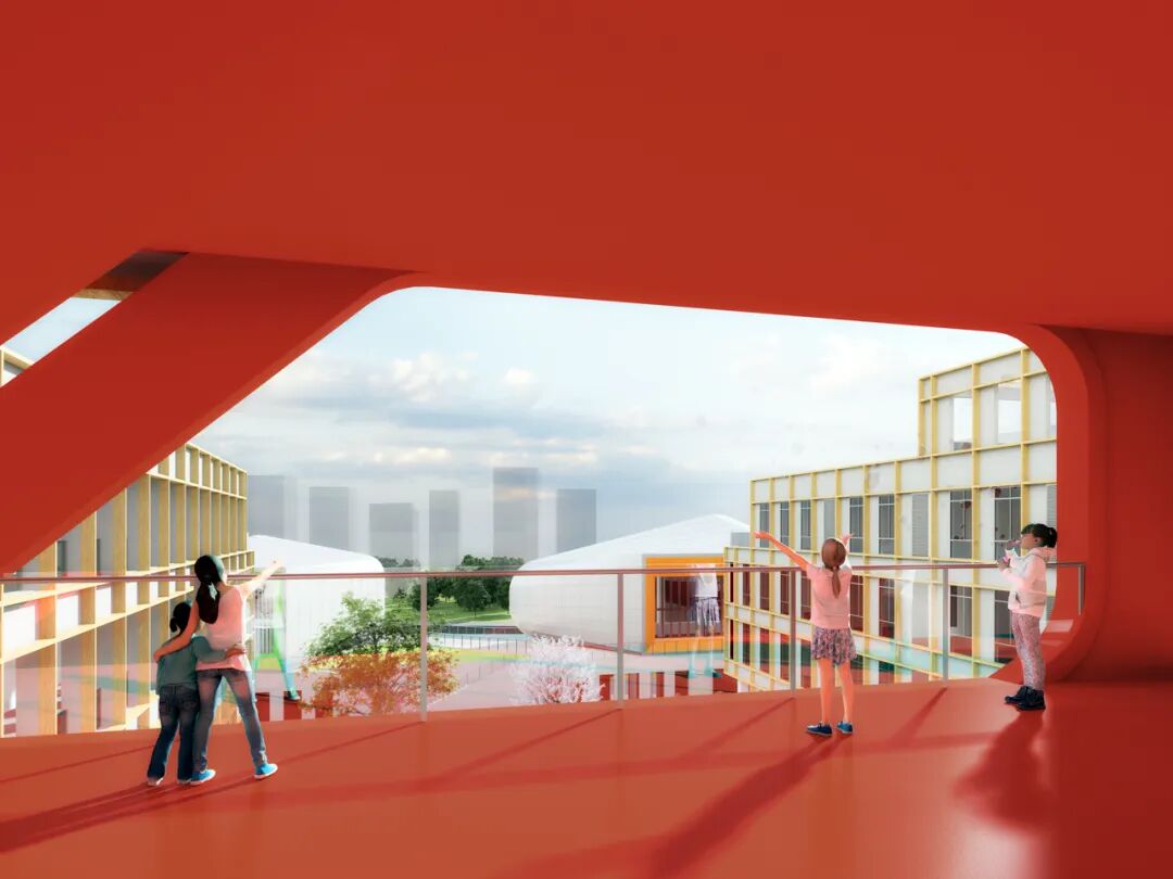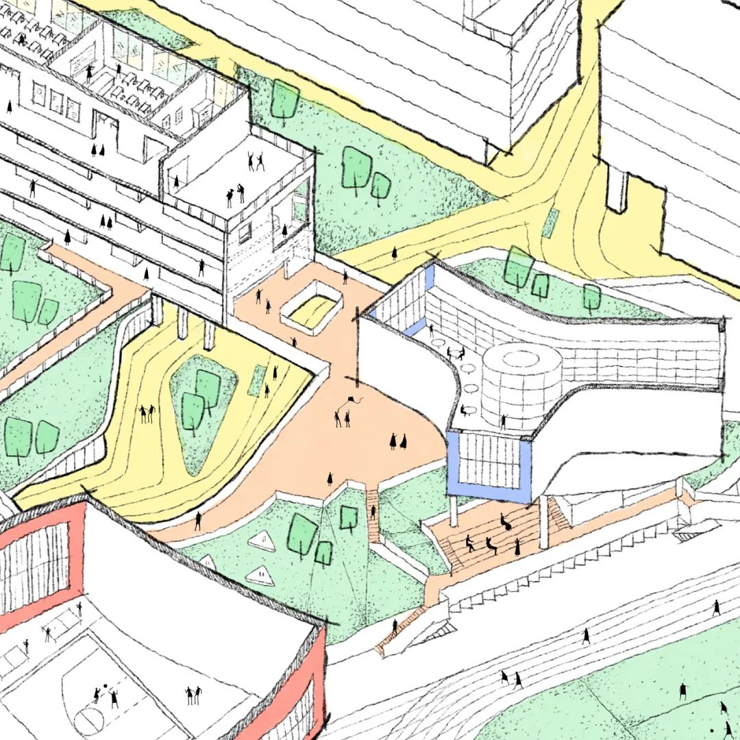 U字形教学楼面向街道的一侧围合起来,阻挡来自外界噪音。在建筑立面上,点缀了颜色与形态各异的“口袋公园”与屋顶爬架,形成了极具标志性的城市界面。