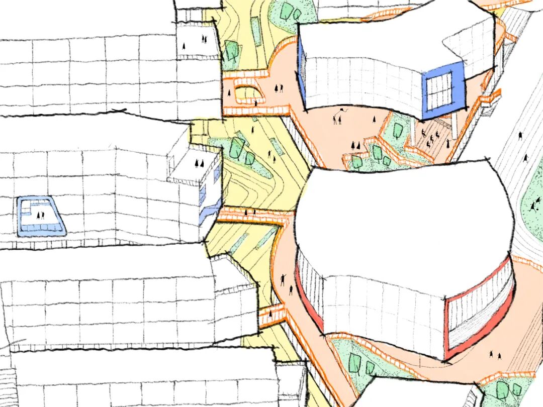 街道一侧将公共空间打造为一座校园中的“文体活动中心”。建筑群由四个大小不一、形态各异、充满趣味的形体构成,分散坐落于景观坡地上。孩子们可以自由穿梭其中,进行交往与活动。