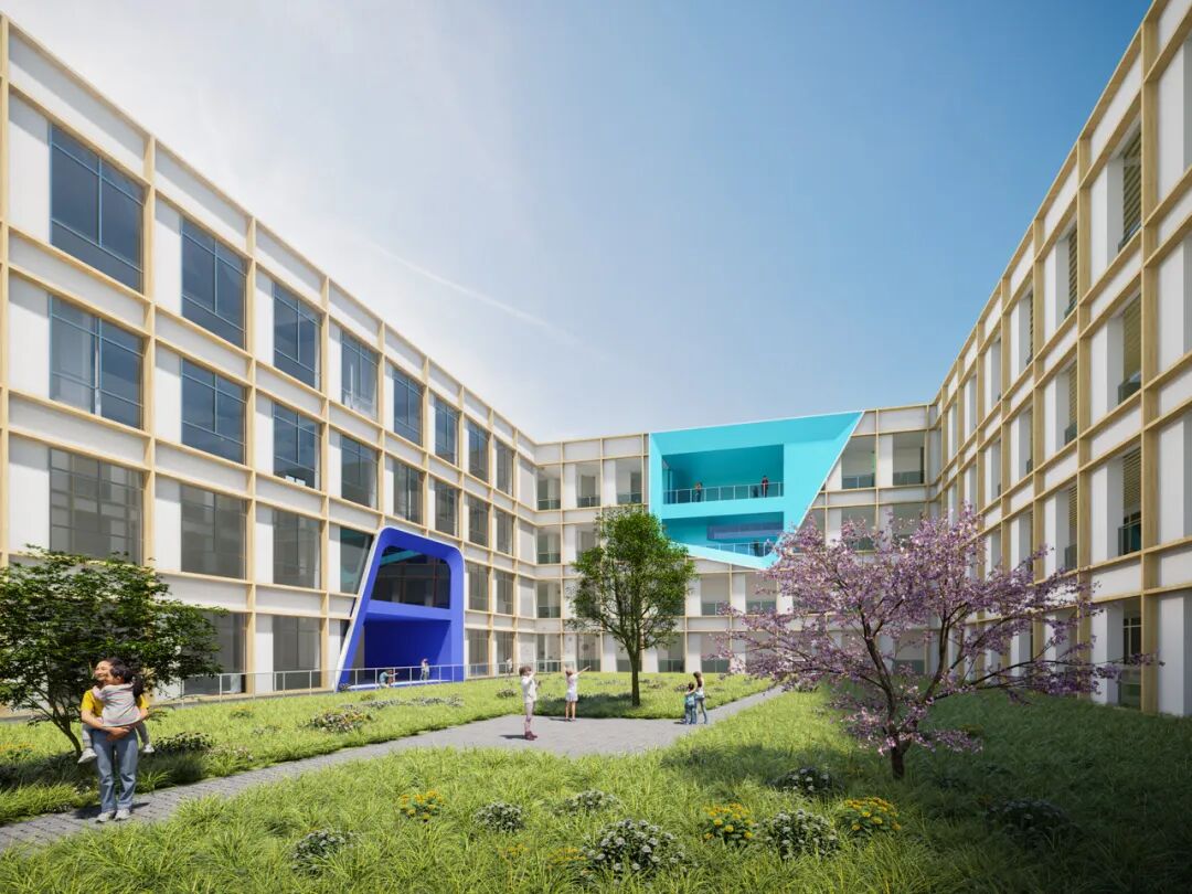 The U-shaped teaching building is enclosed on the side facing the street to block external noise. The "Pocket Park" and roof climbing frame on the building's facade create a meaningful urban interface with varied colors and shapes.