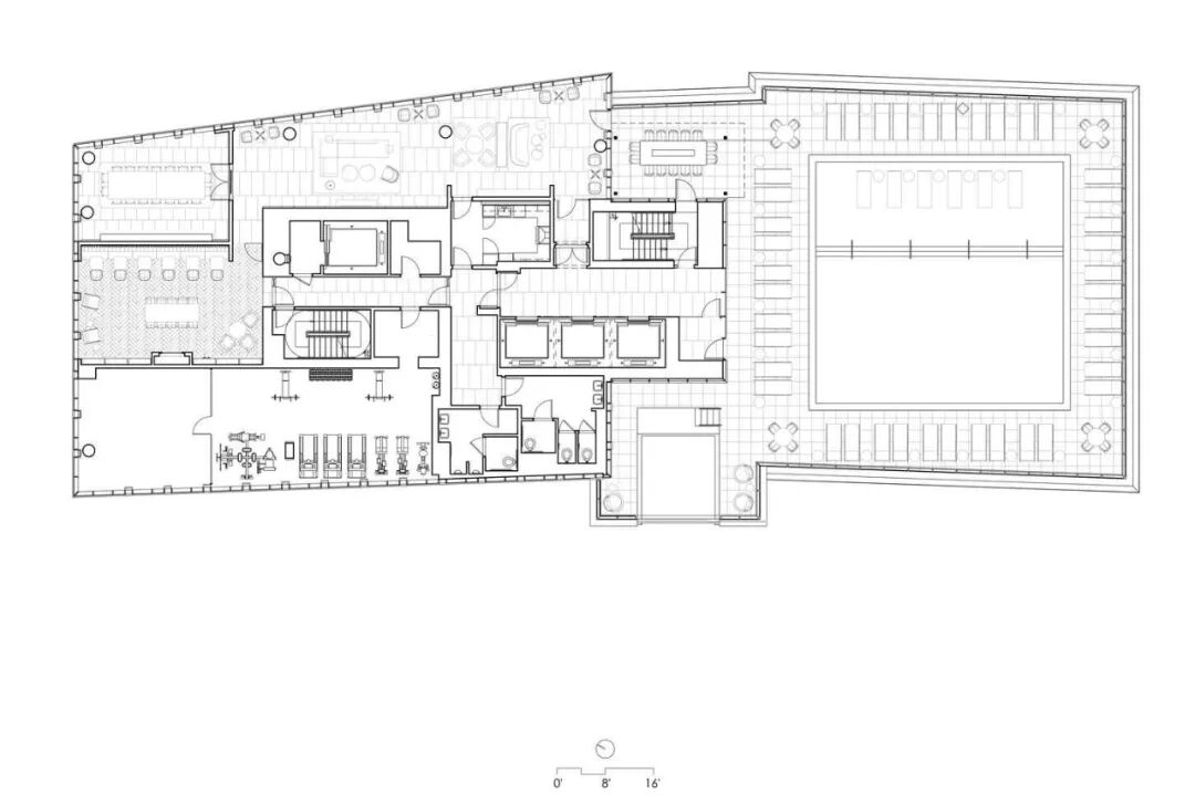Rooftop amenities include a fitness room, business center, private dining room with a catering kitchen, a game room, lounge, and an outdoor pool deck, featuring a saltwater pool and a separate clear-bottom pool that overhangs the 27th-floor amenity terrace on the west side of the building.