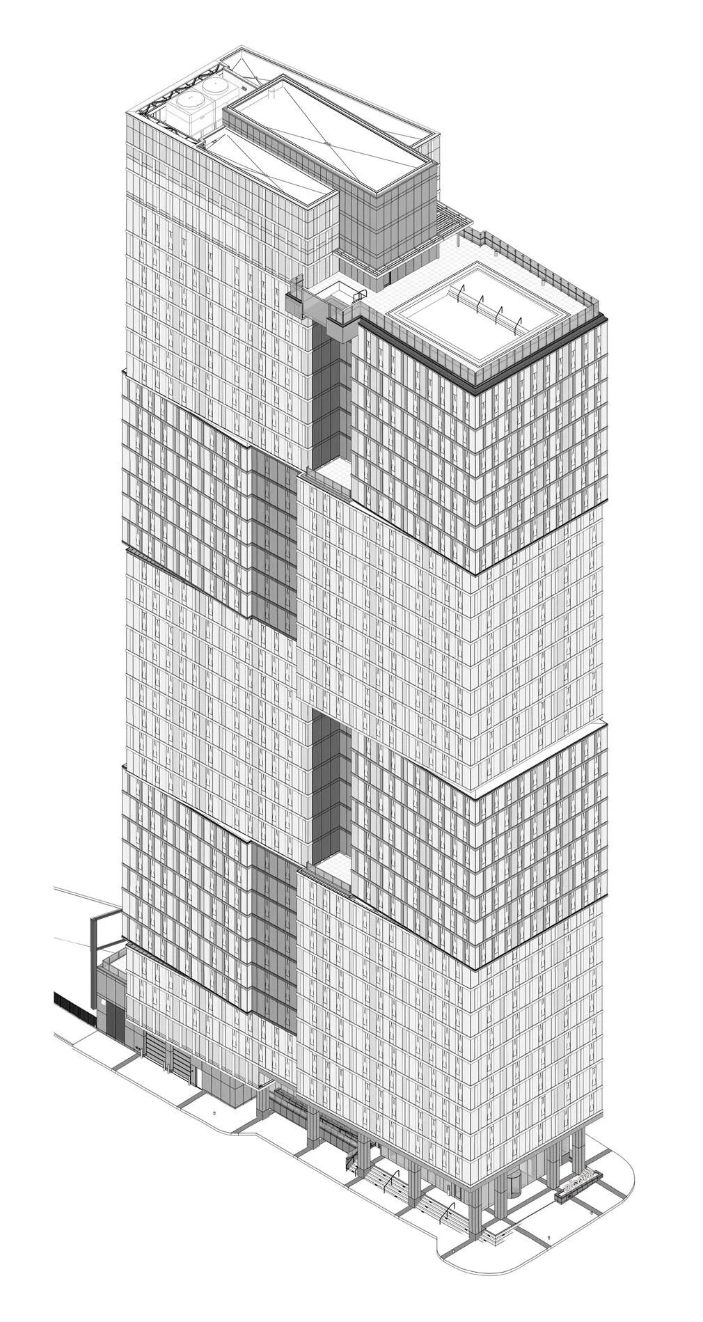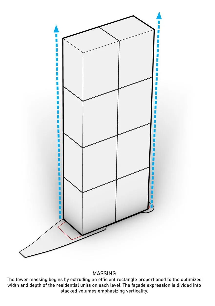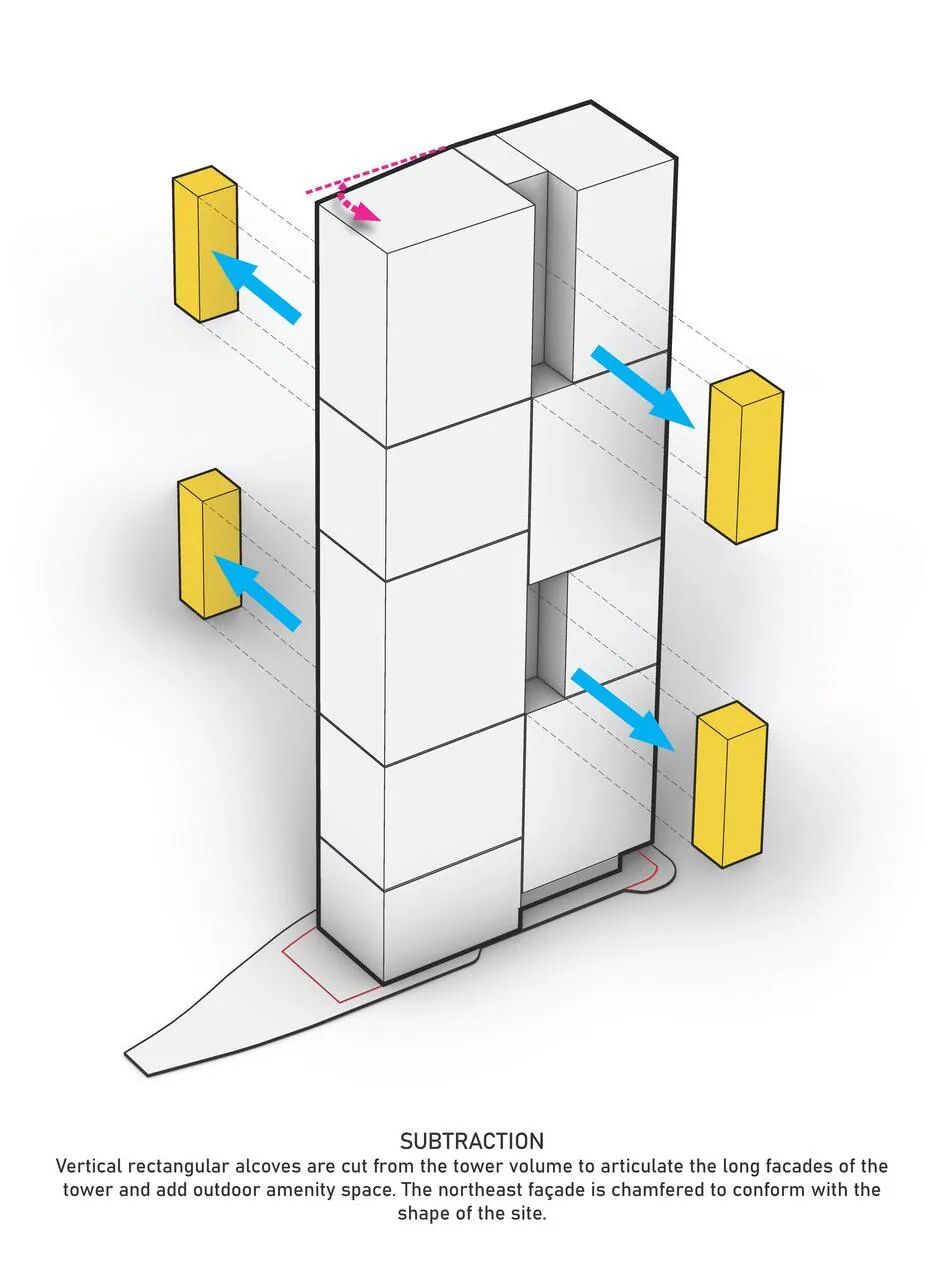 The building is composed of a series of stacked, shifted cubes organized in pairs on four levels. The unique arrangement opens up inner sections of the building and allows for unique views and alcoves. The tower footprint maximizes the site, with the building providing 32 studios, 224 one-bedroom units, and 100 two-bedroom units. Two second-floor units have adjoining, private outdoor terraces. The building façade uses an intricate window wall featuring two varying shades of glazed metal panels, which frame floor-to-ceiling glass for each unit.