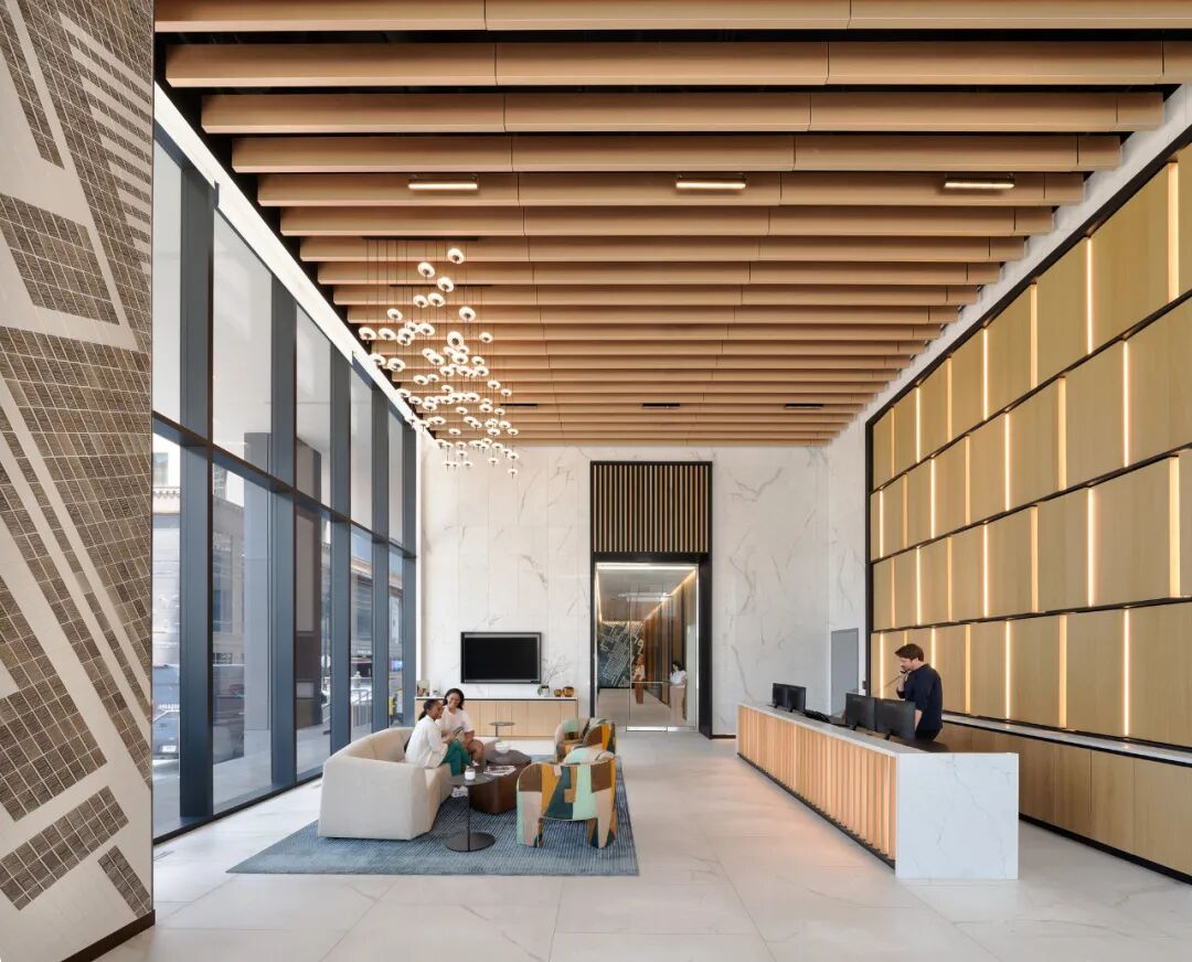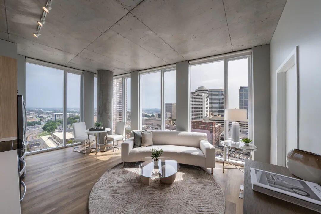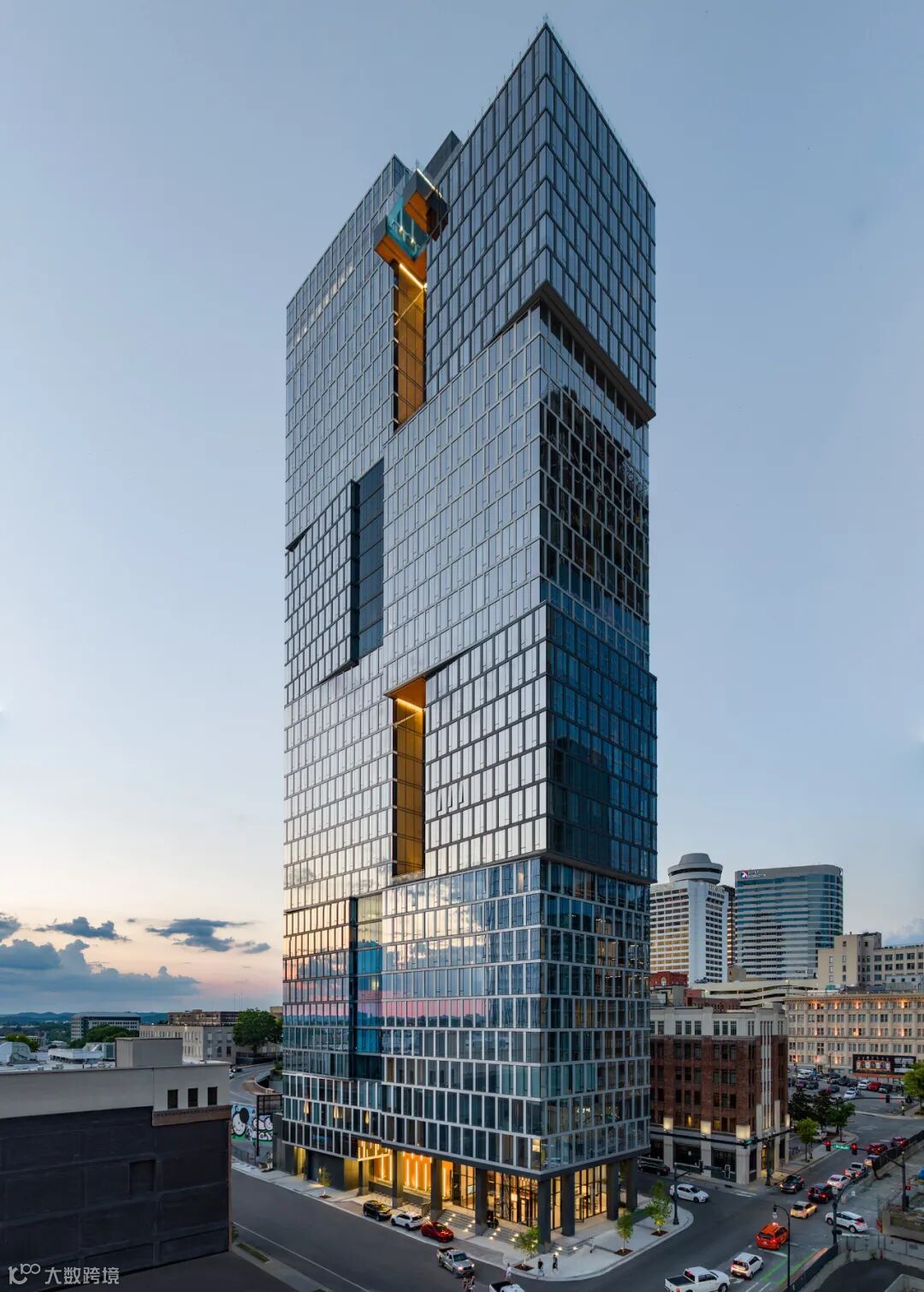 As part of the overall program, signature amenity spaces are creatively placed within four warm-toned cutouts, or alcoves, that feature intimate, communal outdoor terraces. Two of the 75-foot-tall terraces face east toward the Nashville skyline, and two others face west, with unobstructed sunset views.