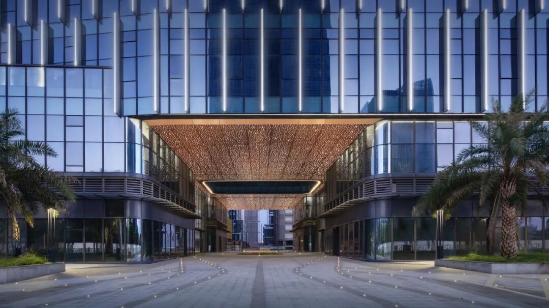 项目在非对称的空间布局中打造了大尺度的公共平台,包括视野开阔的开放性景观阳台和空中泳池广场,提供一个契合创客群体工作-生活需求的非正式空间。中庭的天幕泛光通过材料反射分析、综合天花系统及色温控制等方面以光学模拟星幕,结合金属完成面和利落的线条,塑造一个极具仪式感的主入口。这是基于现象学角度对建造逻辑的理解,暗携着宇宙星空的迷离。
