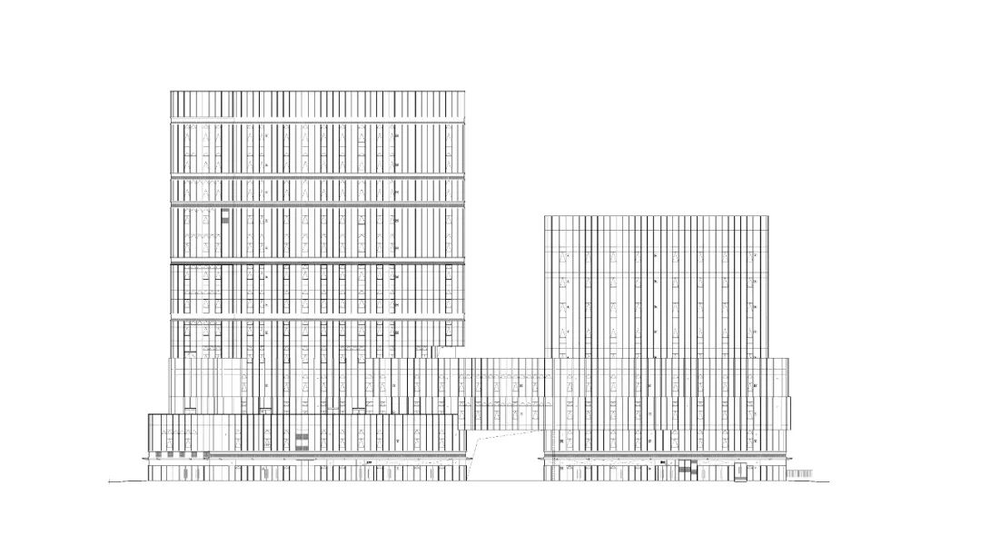 尽管内部单元采取多元组合的灵活形式,外立面设计则运用了精简的幕墙系统,从而获得简洁、干净并统一的外观。立面的“分”与“合”,实际上是以实现不同的使用功能为目的。玻璃面板间的锥形垂直金属构件集合成幕墙结构,提供了自然通风和夜间立面照明等功能。