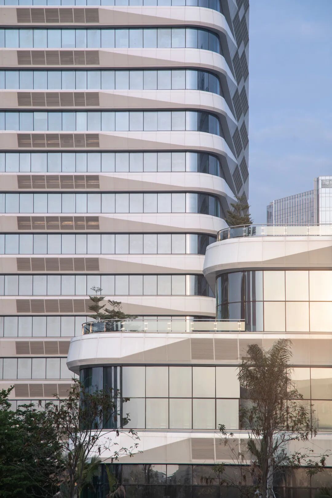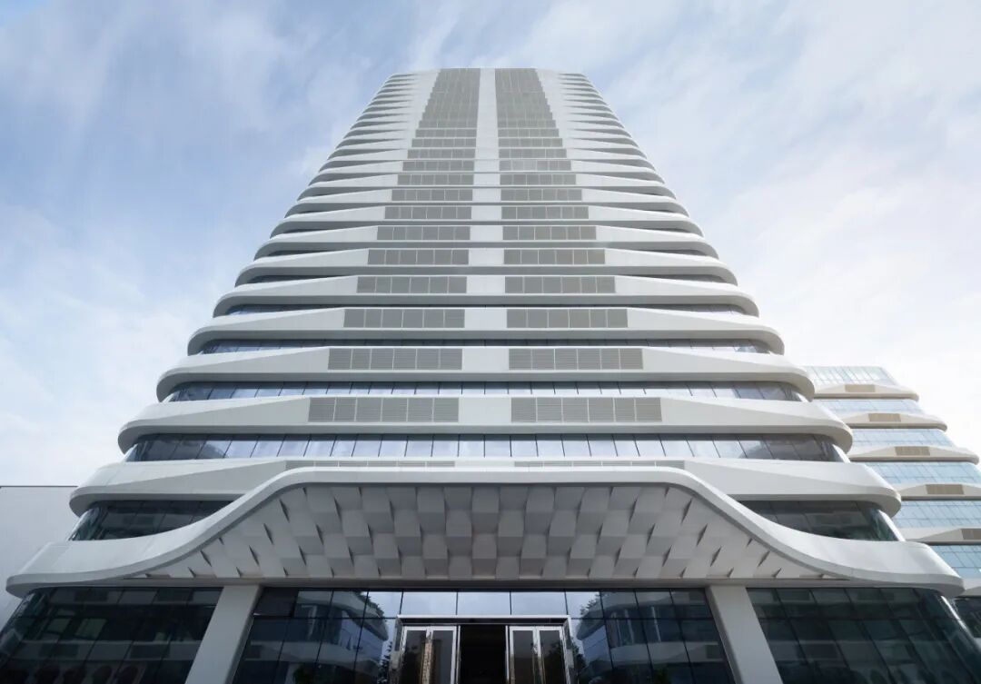 建筑立面体现了标识性与功能性的融合,结合异形构件的几何特征、隐藏设备的需求,团队采用横向构件作为建筑立面的主要要素。为同时满足建筑不同朝向部位的差异性日照需求,在西侧需趋避日晒,南侧引入自然光,建筑师对出挑铝构件作立体型塑的遮阳处理,以漫反射的日照利用方式,能在确保采光条件的同时,有效减少热辐射。