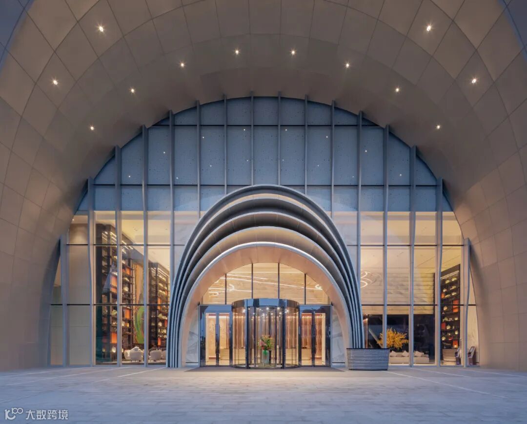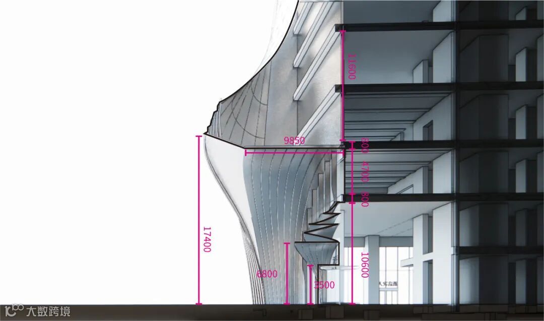 建筑的主入口设计悬挑近10米的雨篷,提升整体视觉观感。设计的核心在于主体钢架定位上,它是曲面幕墙效果呈现的关键,也是整个项目得以落地的基础。