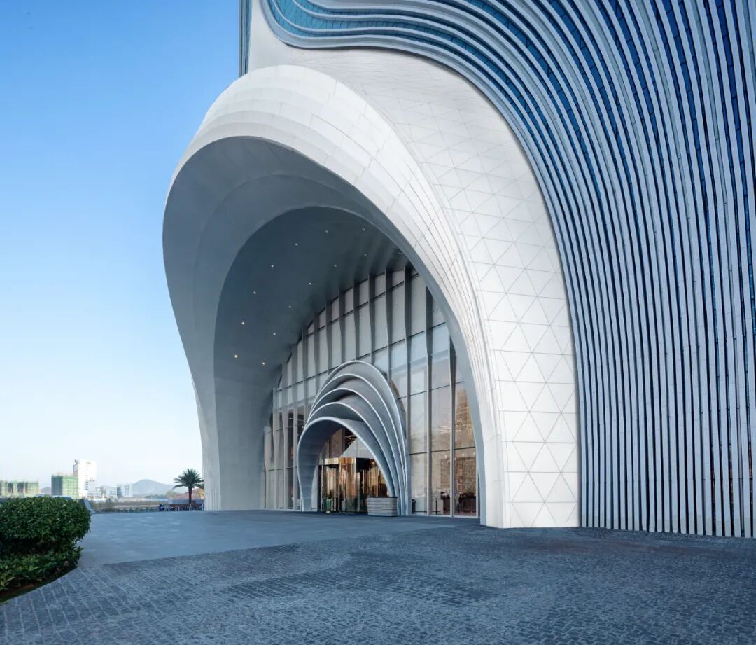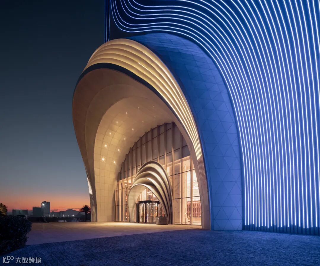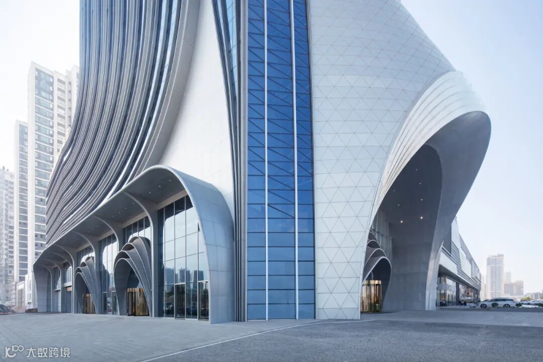 设计团队通过建筑立面透明化、重构内部动线及空间、重新定义裙楼入口功能等改造方式,来营造其城市门户的地标性。大曲面幕墙和大尺度悬挑可在第一时间吸引视线,设计方案将北侧酒店主入口及东侧办公楼主入口进行一体化设计,消除非黑即白的界限,独特的曲面让两立面浑然一体,同时也能从不同角度欣赏到变化的曲面形态。
