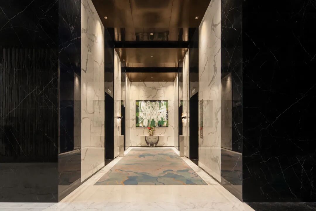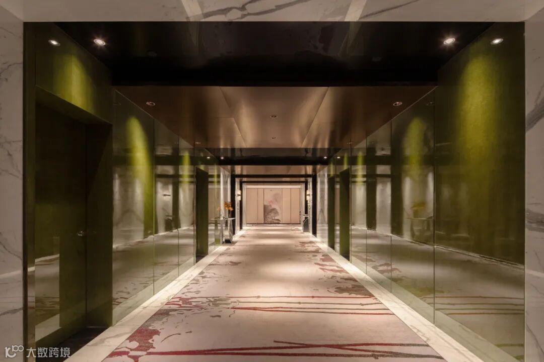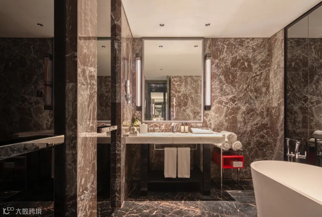 室内以岭南四季为题,通过对自然元素的重新构思,把酒店品牌式的体验贯穿于整体设计。首层挑高超过10m,通过对其通透性的打磨,室内与室外的界限被进一步消融。巧用意大利经典石材与中国传统水墨的对比及相成,营造空间的戏剧化效果,并运用了多角度和折射元素回应参数化立面。