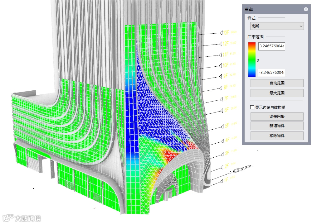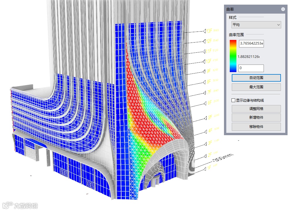 立面优化的最大挑战在于主入口造型的落地,13层以下形成自然曲面,并在4层约17m的高度完成12m的大尺度悬挑,此造型背后以3层精密的钢结构作支撑。
