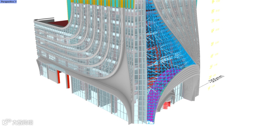考虑到当地施工水平所限,设计团队用参数化工具将幕墙划分为多个小型基础单元,通过精准计算板块尺寸,以尽可能少的单元种类与数量来控制曲线的交接和过渡,在高精度实现设计的同时,最大程度压缩建造时间、建筑成本和技术难度。
