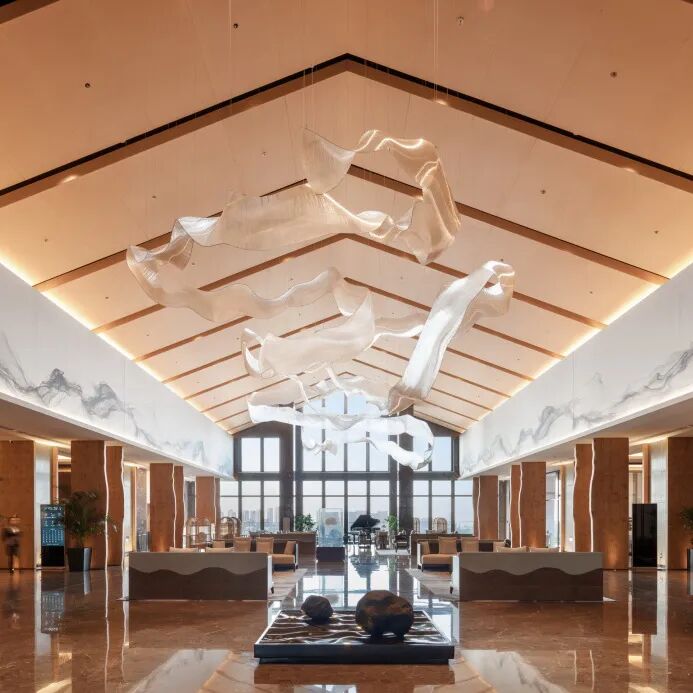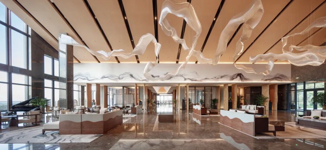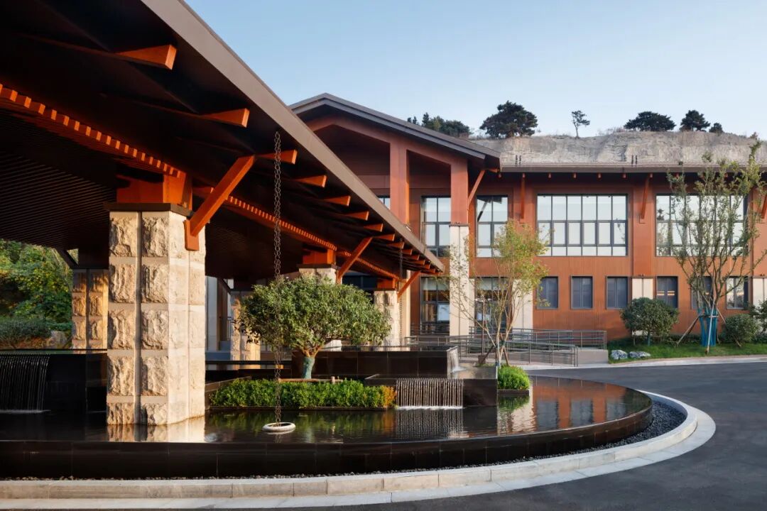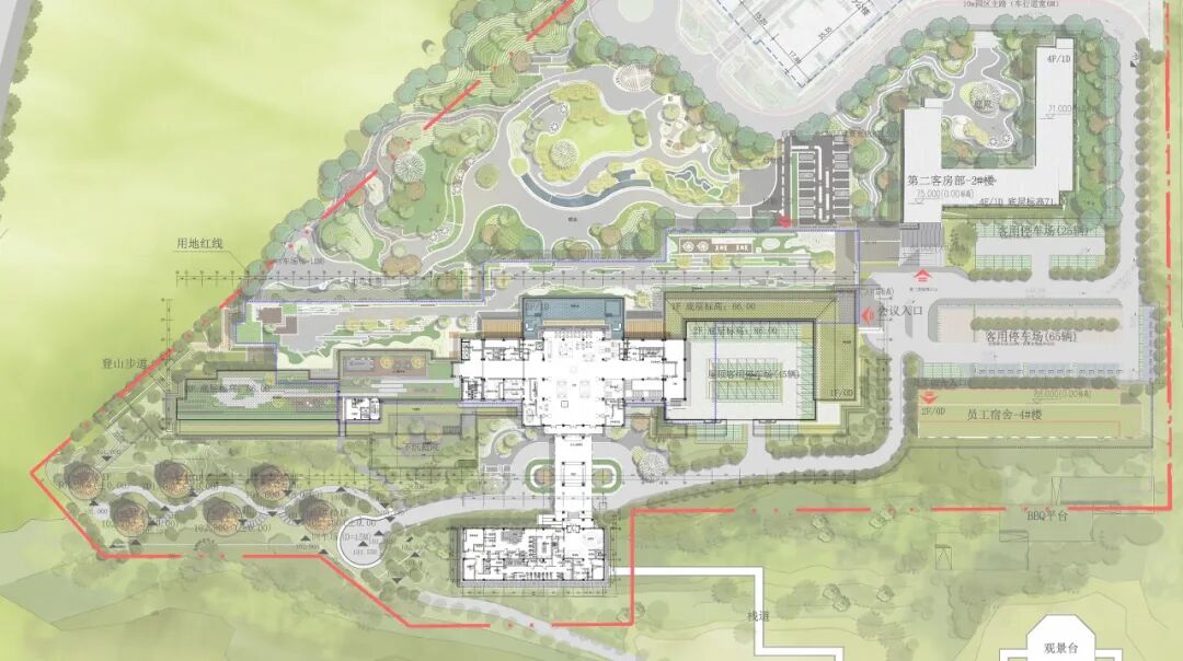 酒店主入口及大堂设置在最高处台地,形成自上而下的内部流线和登高望远的视觉效果。公共用房及客房组团均因循山势退台布置,包括大堂及客房在内的所有面客房间可近观山下生态景观区,远眺森林公园群山美景。