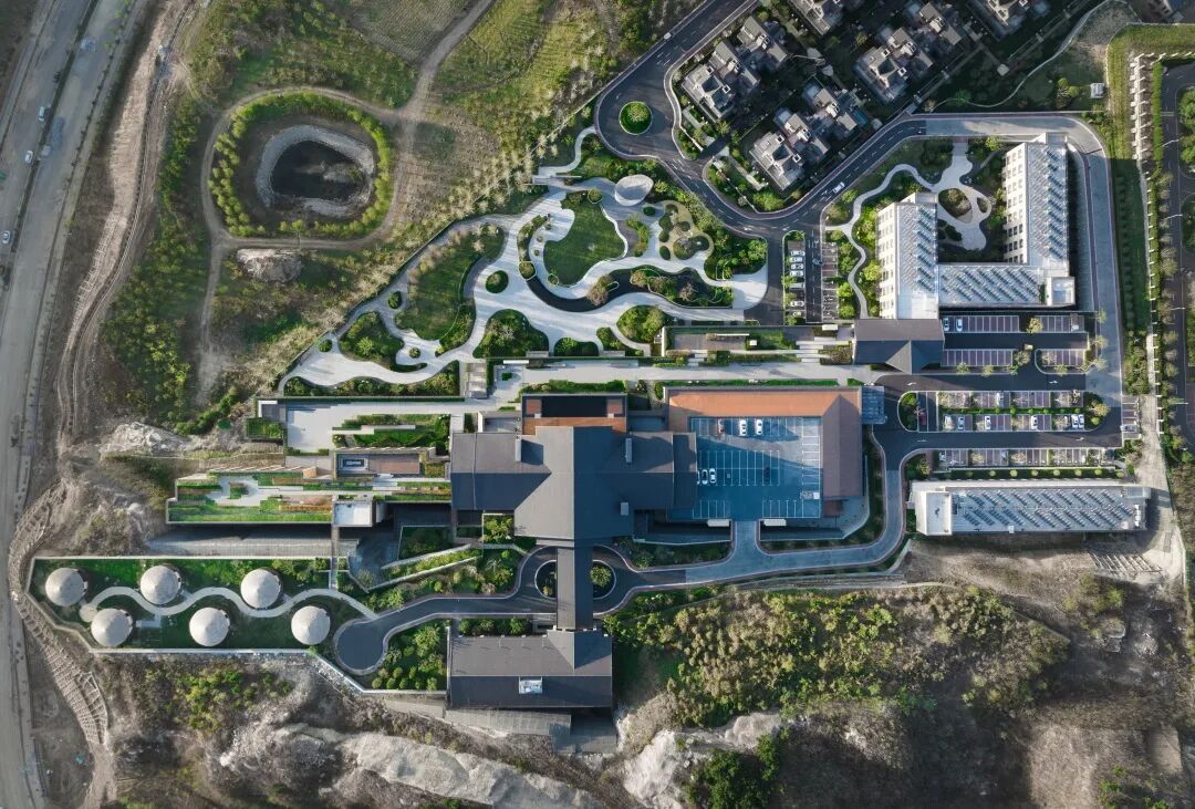 青岛红石秀景酒店选址于青岛市西海岸中德生态园龙斗山北麓,基地原为采石坑废墟。破损的山体犹如绿肺中的一块疤痕,“有机发展”理念下的山体生态修复计划衍生出了这座建筑。2018开始,历时五年完成了该区域生态修复工程,并同步建成一座五星级标准的会议度假酒店。山林彻底抚平昔日“伤疤”,龙斗山实现了从废石窟到绿色生态酒店的“蝶变”,成为亚洲较大被动式酒店。