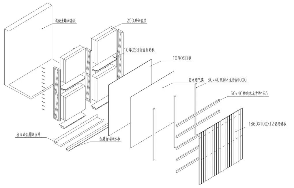 竹木外墙龙骨形式是由芬兰木龙骨与欧松板构成的剪力板—可以通过标准化设计后在现场外预加工然后到现场安装,用断热锚栓固定在基层结构墙(梁)面上。剪力板之间墙面分层锚粘嵌铺两层岩棉保温板,木构体系提供足够的强度安装分层承托保温块(重量)的水平垫板,同时满足外墙板安装后的抗风压性能。