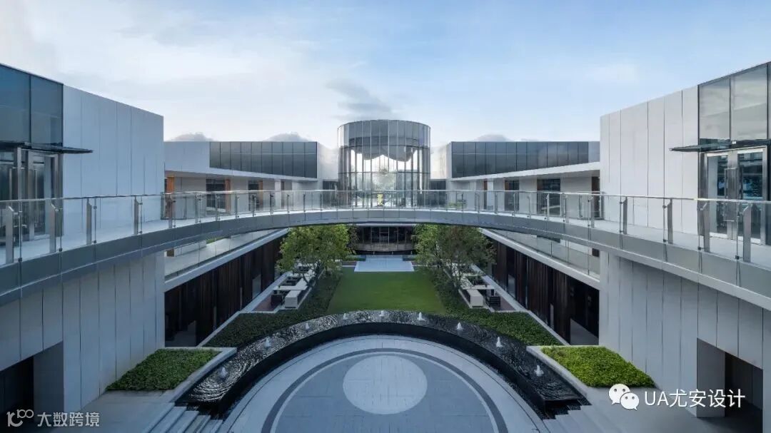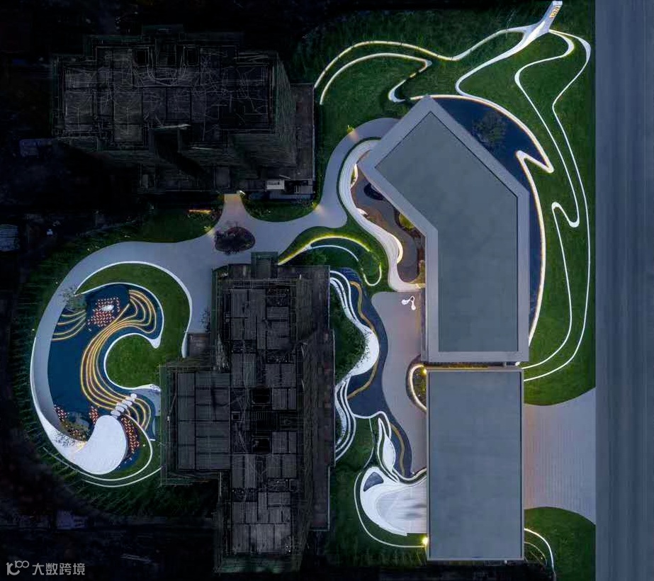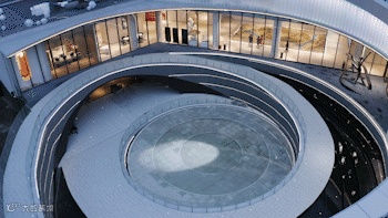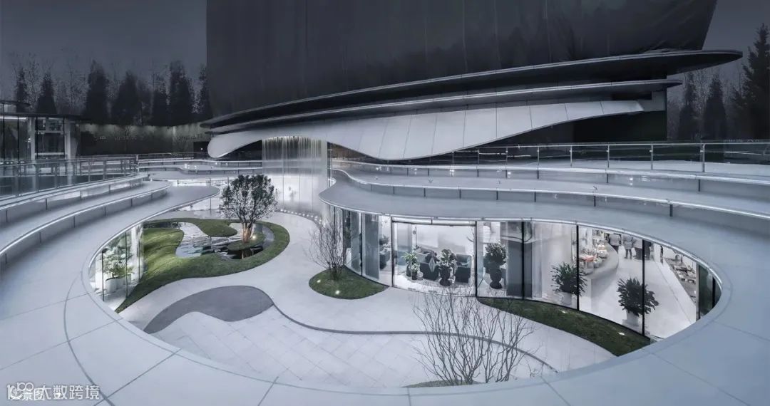 搜建筑注意到,流线型的下沉庭院,在建筑的外围设置层叠三次犹如跌浪般的三层檐口,并在檐口中间设置了灯带,这样在夜间会有三层流线型的光带围绕在主体建筑四周,形成荟聚如云中明月般的效果。