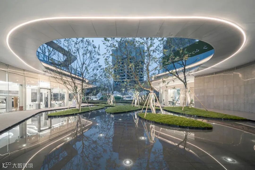 武汉城投南山长投·领峯设计从武汉江城的场域气质出发,结合建筑架空层和下沉庭院,以镜水面与水幕串联三层立体无边界景观,汇聚天光云影,定格水天一色,勾勒空灵纯粹的未来之境。