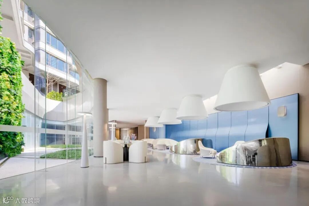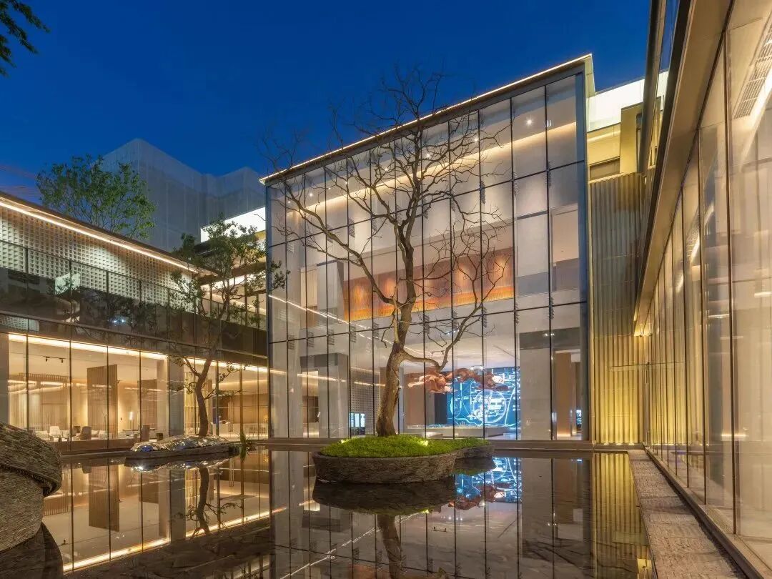 随着抬升的建筑,视野抬高,周边景色尽收眼底;落地的全玻璃幕墙,打开视线通廊,天光云影倒映水中,让人们能够在一方天地中体会自然的静谧与恬淡。