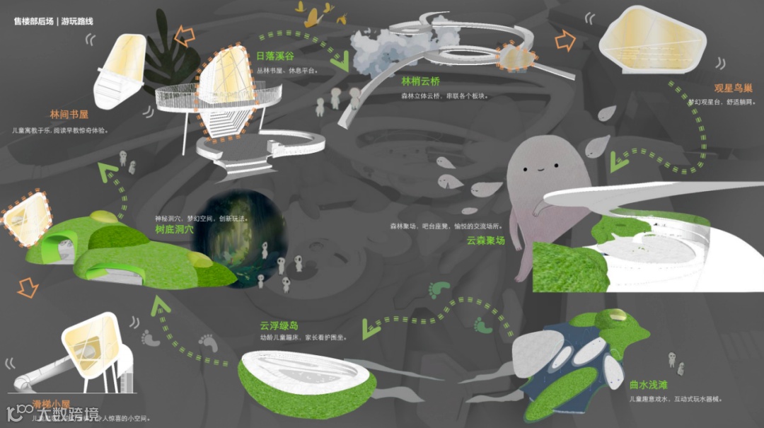 浅滩、树洞、绿岛、云森、幻彩盒子……充满想象力的造型与功能设计,多种尺度、架构的推敲组合,以及复杂结构下的工艺落地,通过多方位的协作构成让全龄儿童们肆意钻进童话世界中,在玩乐中学习来自大自然课堂的诸多奥秘。