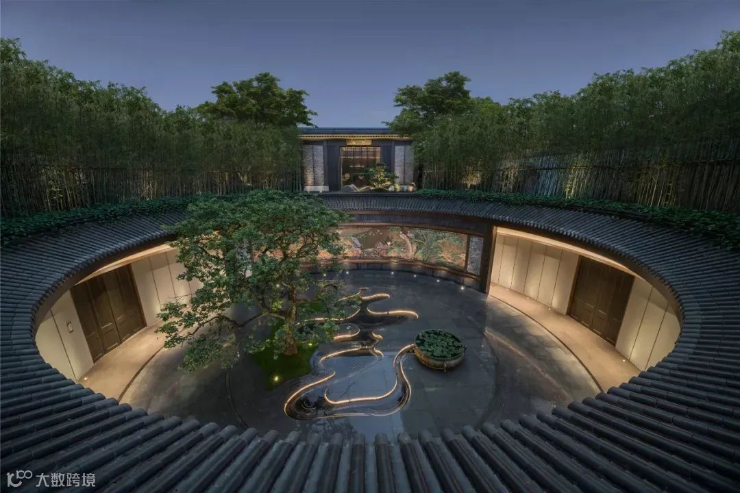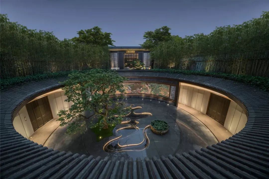 广州建发央玺下沉庭院,圆形屋檐由外而内设计,象征着"天圆地方"的理念。