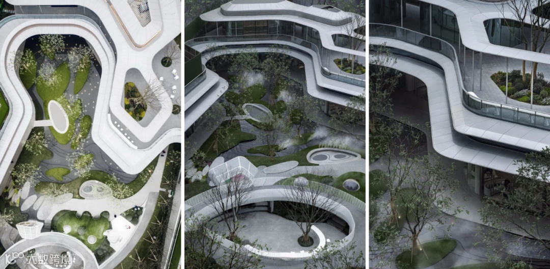 建筑上下两层衔接了中庭西面的高差,建筑轮廓以自然流畅的弧度为景观奠定了优美的曲线基底。