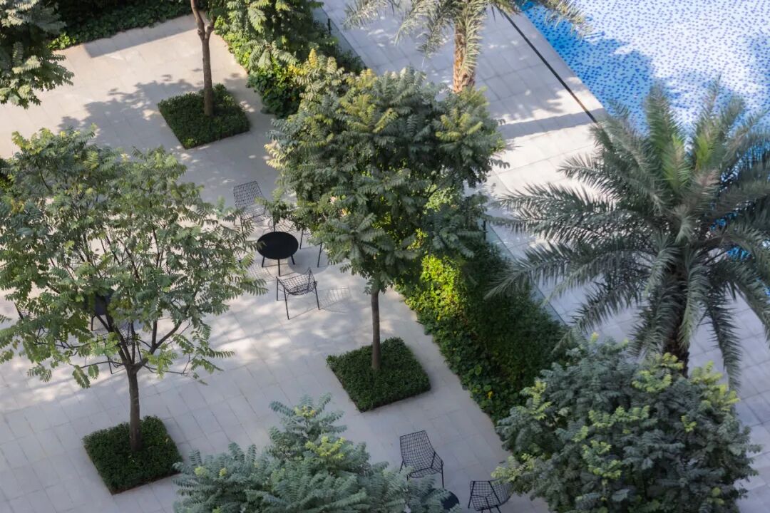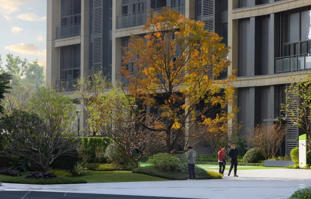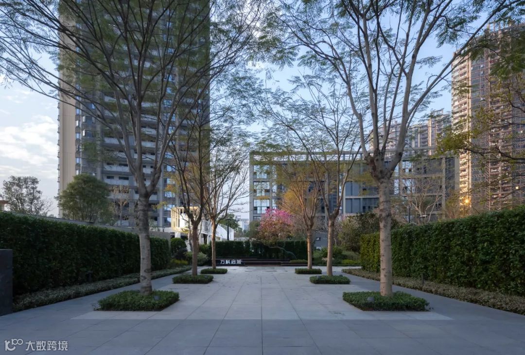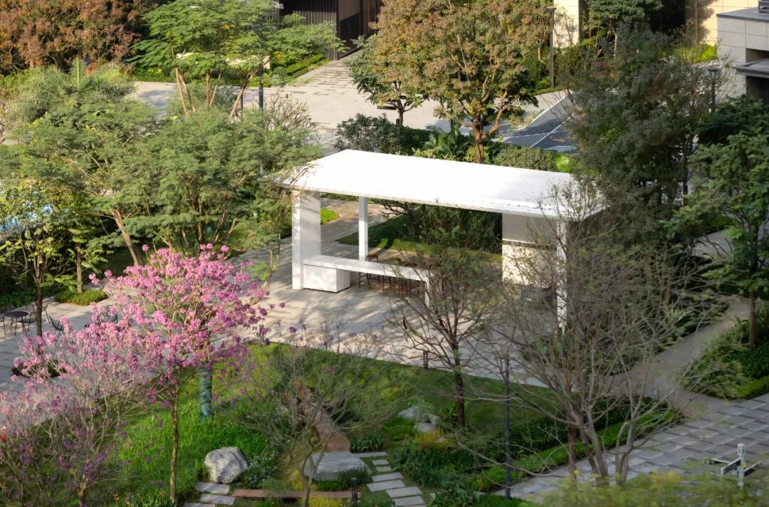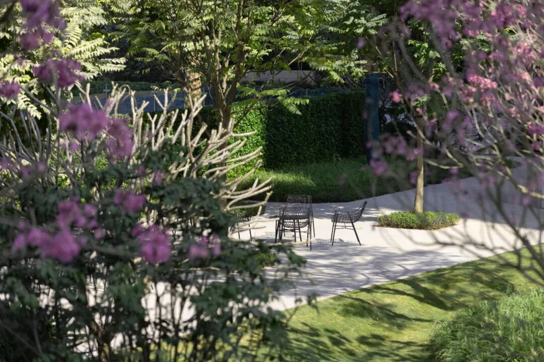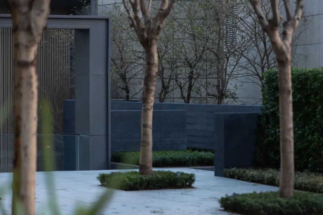 林荫树阵广场,选用有较高观赏价值和鲜明特色的高分枝乔木,一侧绿篱围合,创造符合人的心理需求的领域感和归属感。细致而有温度,赋予生活一种清逸滋味。