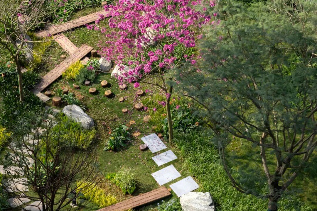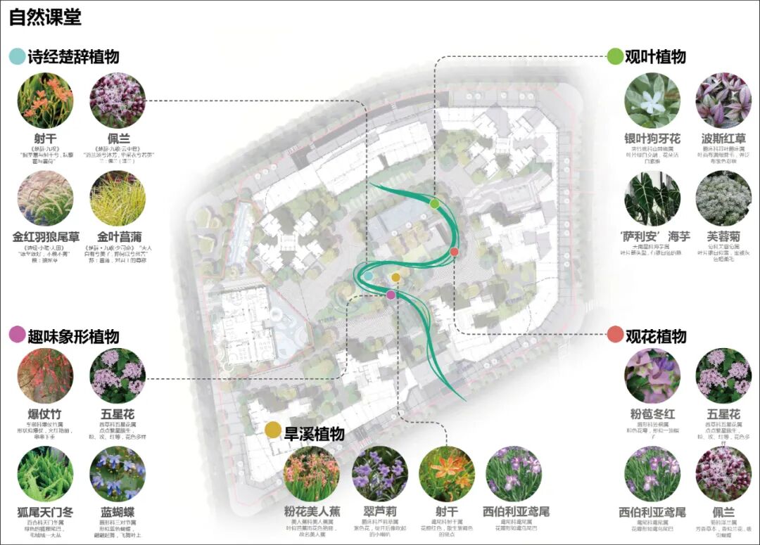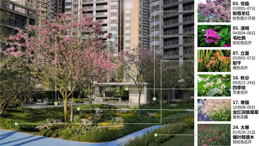 绿荫漫园,花香四溢,启城家园的绿意,给居者一片私属都市桃源。种下四季流转的植物故事,落地二十四节气植物系统。植物的搭配充分考虑了颜色和质地的变化,结合园区不同场地的植物生境合理运用乡土植物,打造观花植物、观叶植物、旱溪植物、诗经植物、象形植物五大主题区,丰富的品种也为后期自然教育提供了合适的场所。