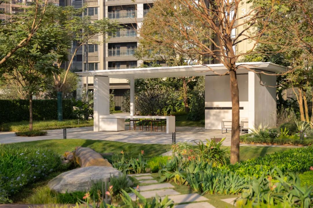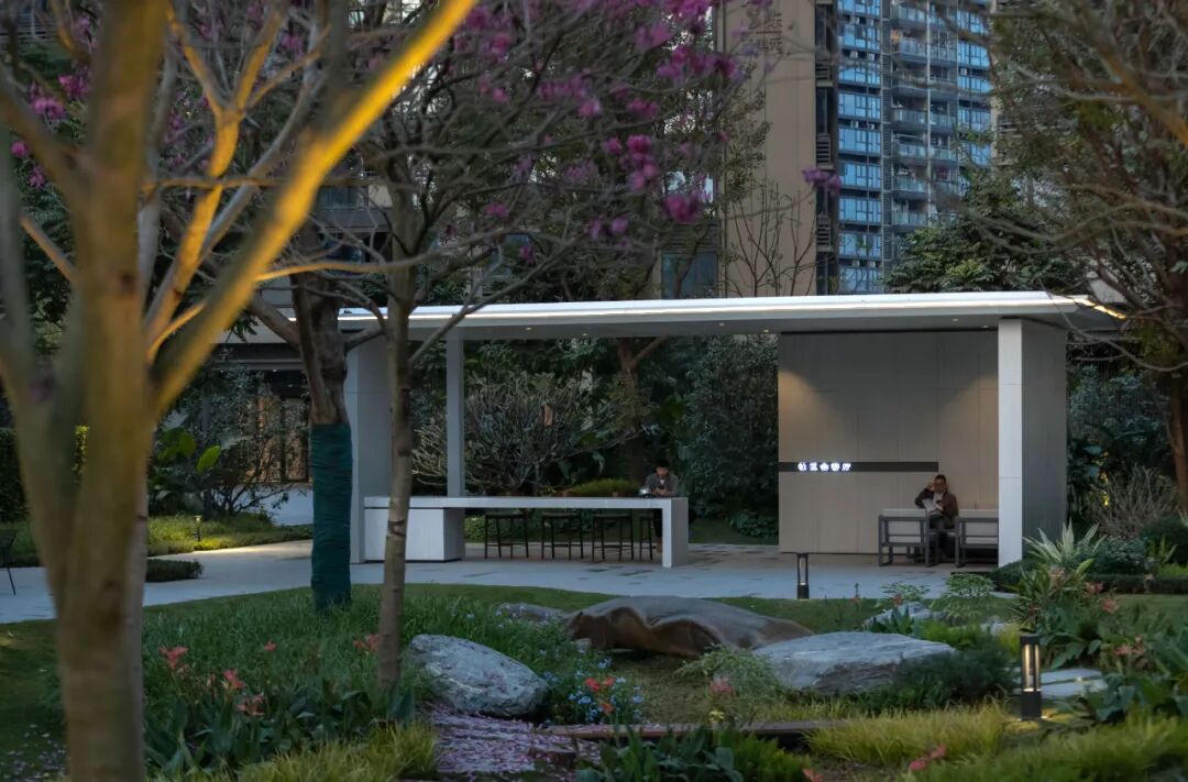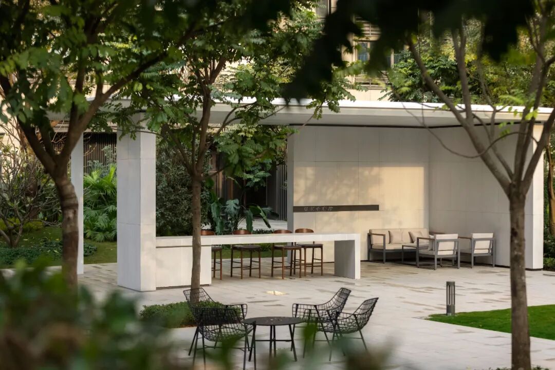 邻里交流会所,绿植葱茏、和煦暖阳,将自然绿意引入空间,家人朋友在此处聚会、饮茶、围棋、休憩,生活笼罩在花木摇曳的诗意之中。