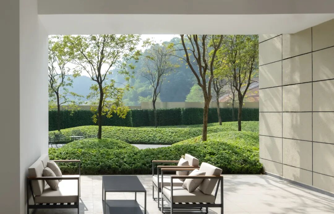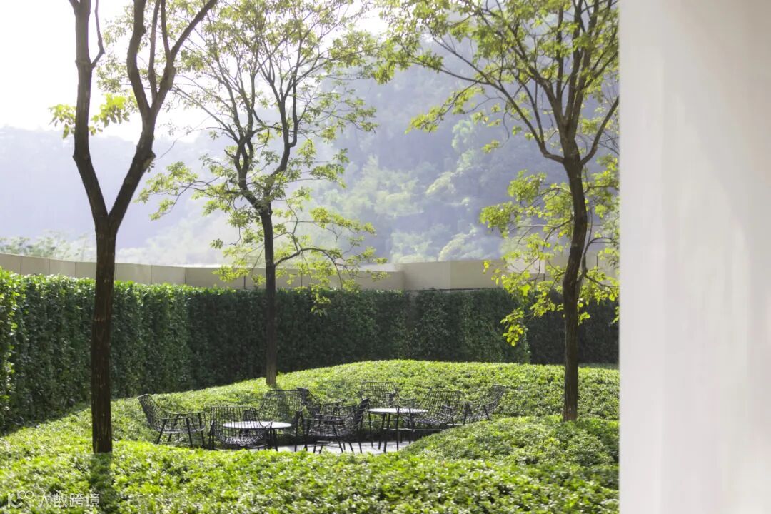 阳光绿谷以极简的笔触抒绘型格,以灌木创作群山绵延之势,山与林交织,透现出空间的美感与立体之感。放置休憩座位,构建充满乐趣的艺术和生活空间,置身其中令人心境恬淡。