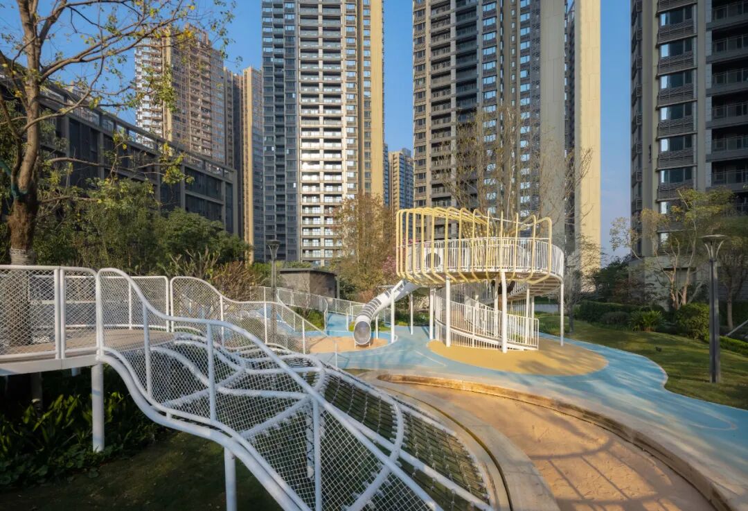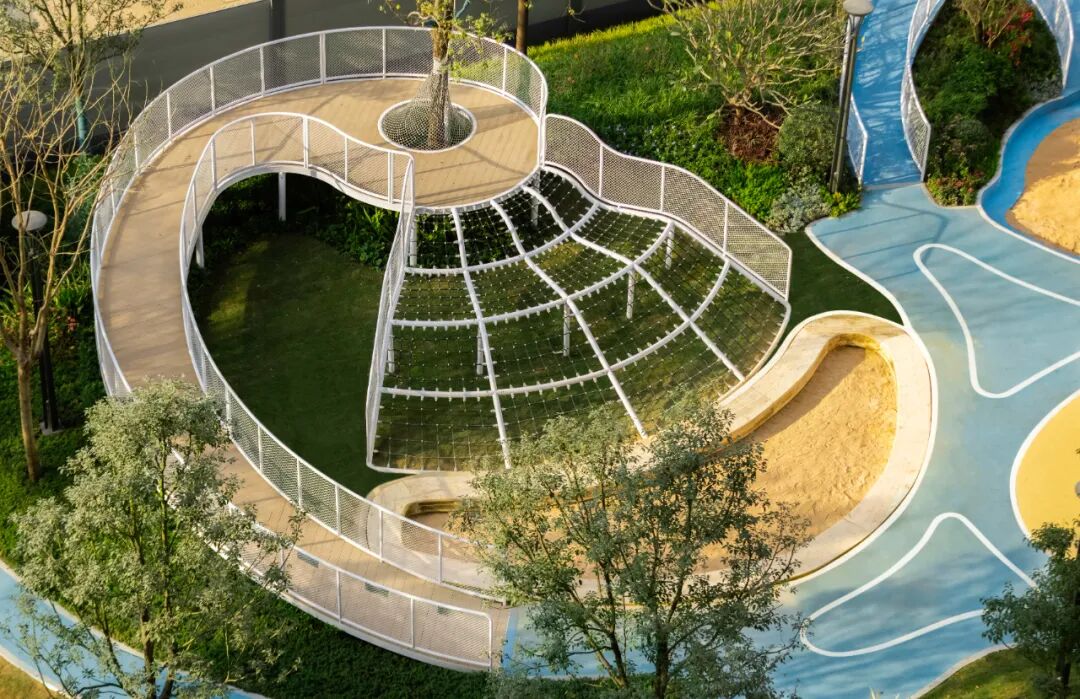 设计充分考虑与周围景观的互融互补,设置满足各个年龄段尺度及爱好的亲自然空间。绿心树屋、冒险爬网、亲子滑梯、沙坑寻宝、旱溪花境、植物科普、环抱看护等多样化的设施,集探险、创作、游戏和休憩于一体。在这里,孩子们可以游乐、玩耍、探知,享受童年的无忧无虑;也可以促进亲子互动,发掘孩子潜能,让孩子在嬉戏中快乐成长。