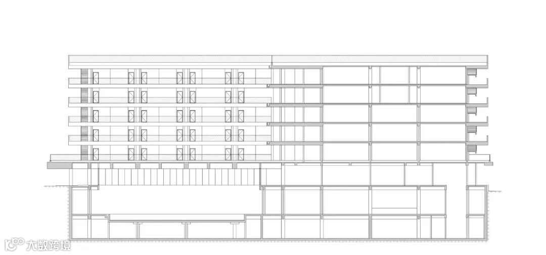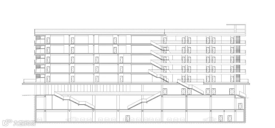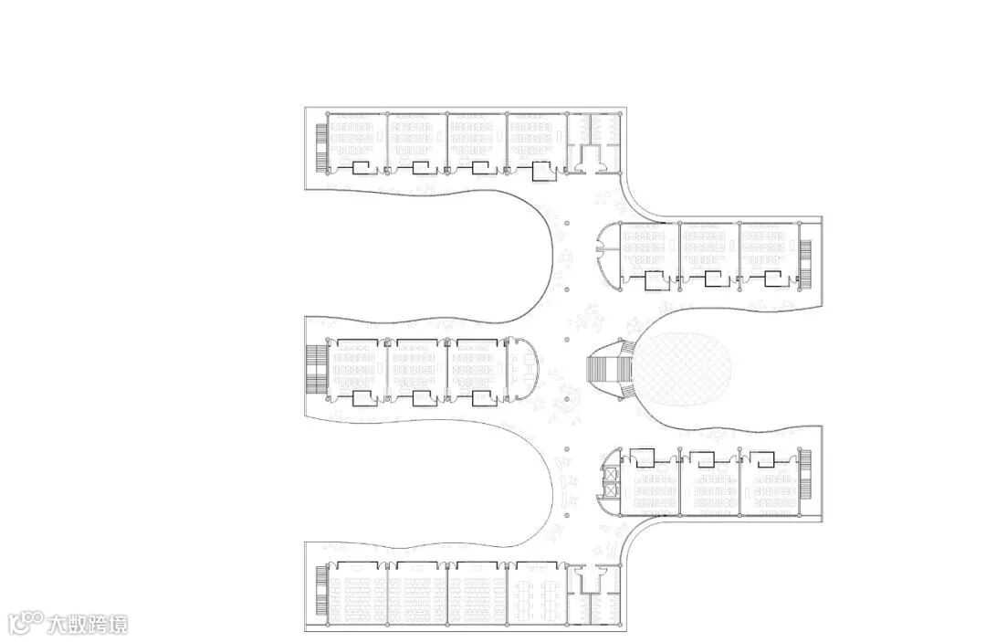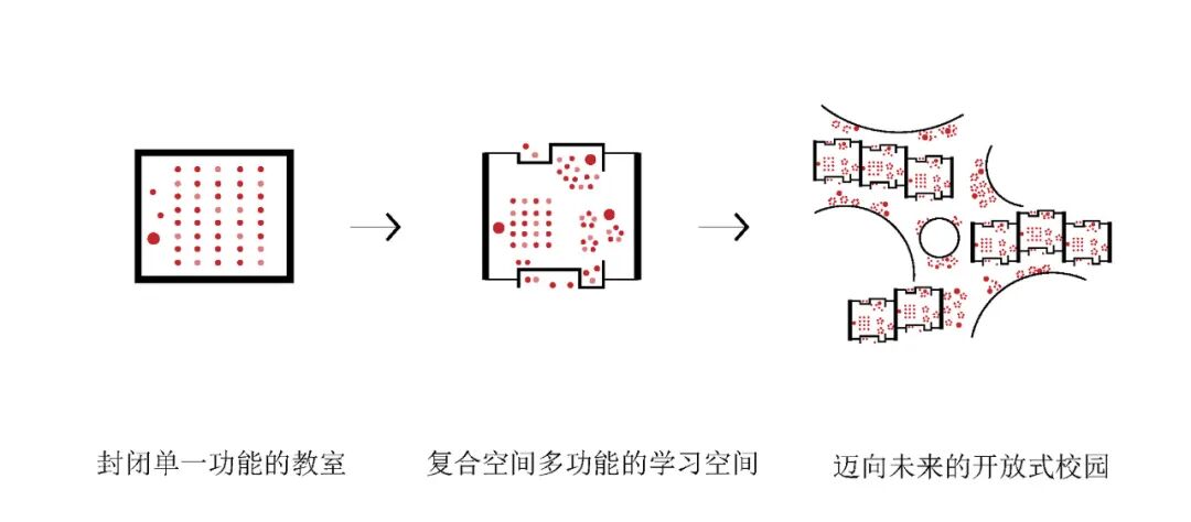 解决方案。既然学生下楼不方便,能不能将户外空间带到各楼层上去?于是在我们的设计中,在每一层的中心位置都出现了一个本质上是露天房间的区域:这个空间有上层的楼板为屋顶,但没有墙体的围合。它像一个风雨操场,同学们可以在任何天气状况下,在这里锻炼、活动、玩耍;它还是一个开放的教室,老师们可以在这里授课、演示,同学们也可以在此自习、讨论。
