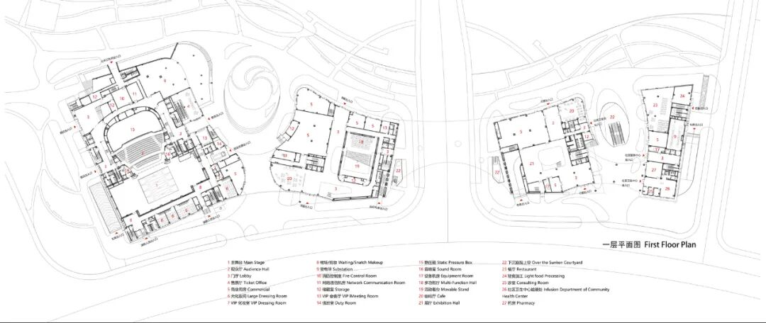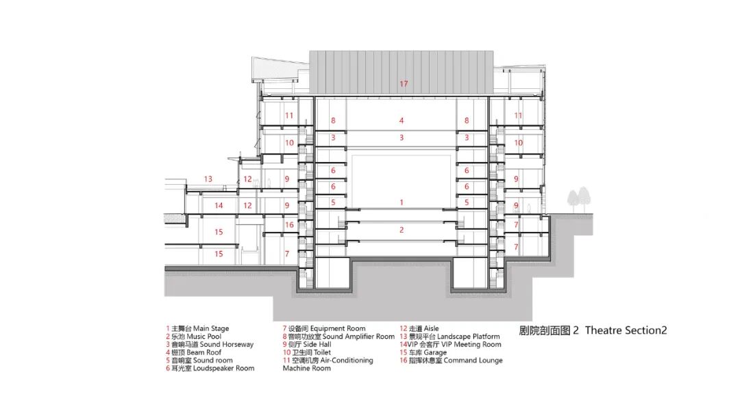 开放与奢华的文学。大剧院位于滨水一侧,面向水面开放。大堂由v形钢柱支撑,钢肋拉杆胶合板点玻璃幕墙覆盖。室内公共空间,简约典雅,与多种商业设施、文化娱乐空间融为一体,营造出轻盈奢华的文化艺术氛围。