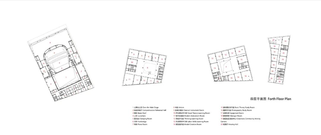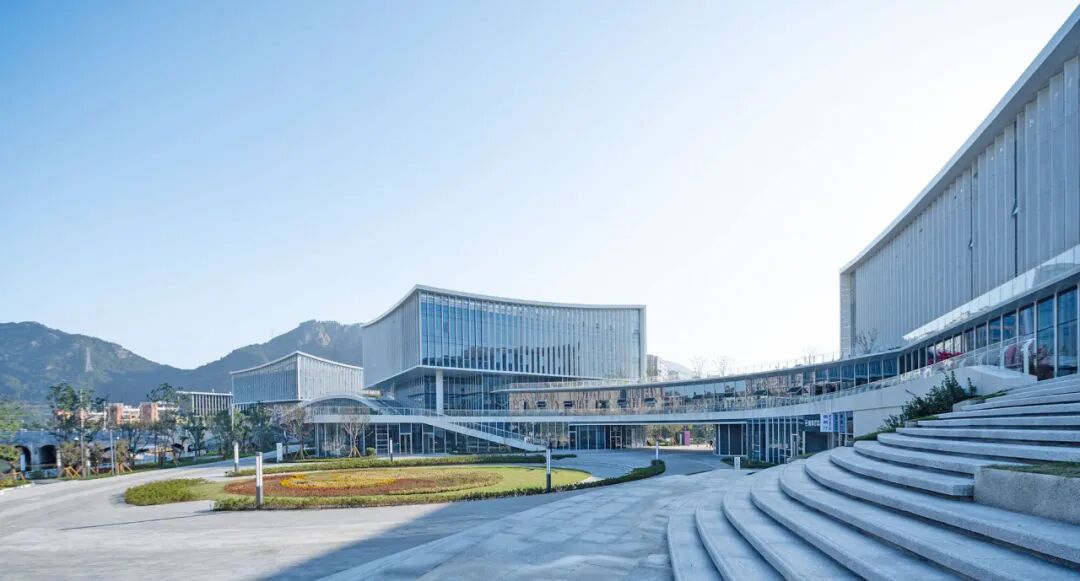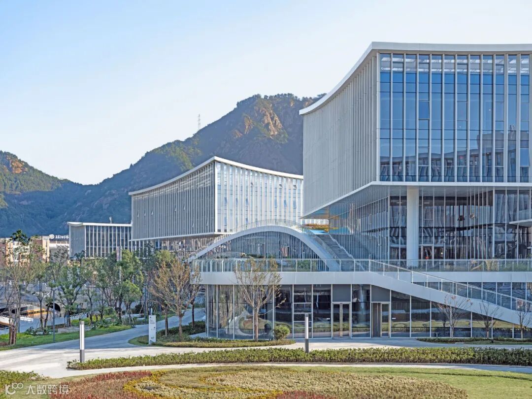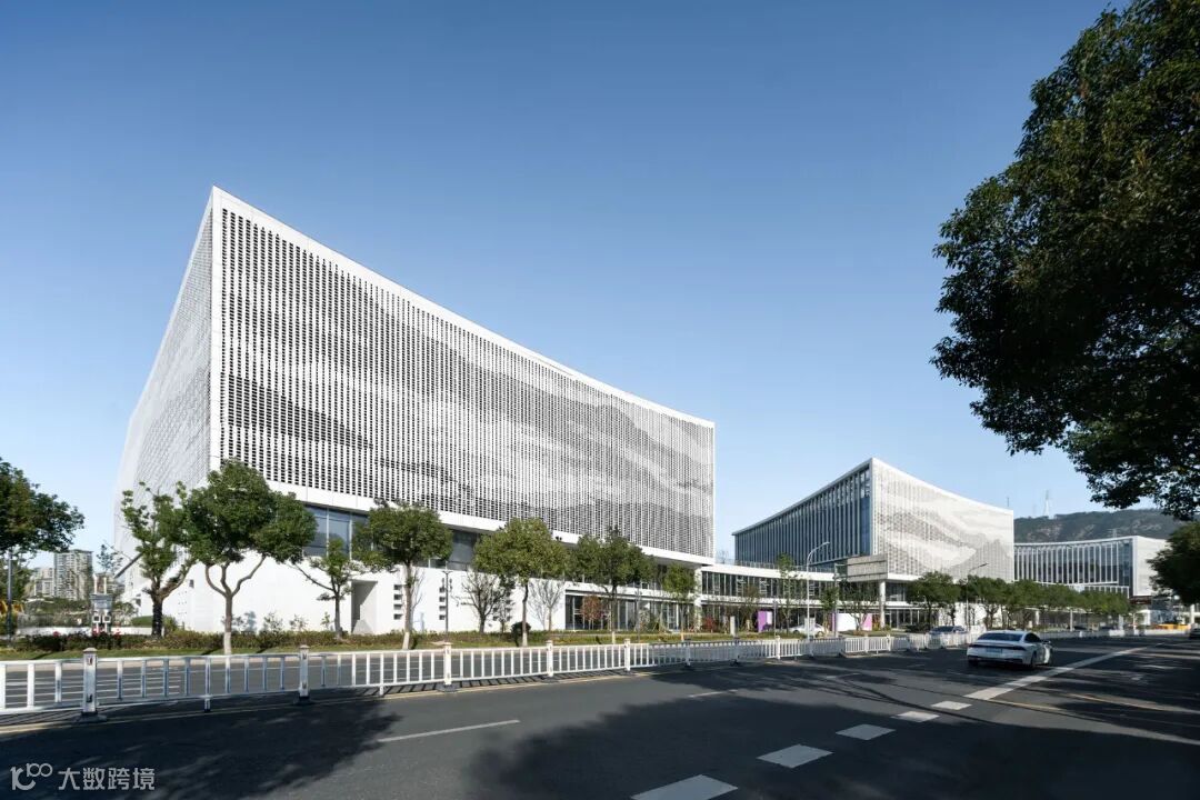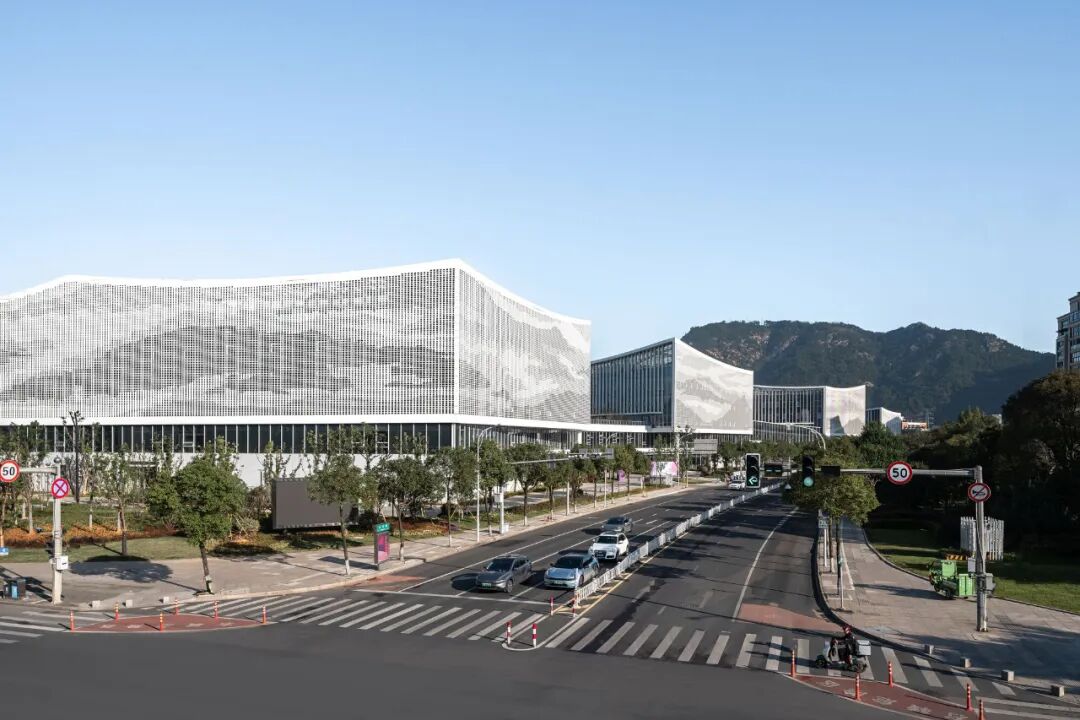 Landscape Scroll, Poetic Jiangnan. On the street side, the façade adopts a double-layer skin, covering the perforated aluminum curtain wall outside the glass curtain wall, and selects the natural picture of Yandang Mountain with wandering clouds and shadows, and then connected to form a complete "landscape scroll", shaping the image of the urban interface on a public scale. On the riverside, the vertical rods of perforated metal plates are used as a metaphor for the keys and strings of the piano. The upper part of the building towers up like a mountain, the soaring roof curve dialogues with the graceful mountain, and the roof Imagery of traditional Chinese buildings.