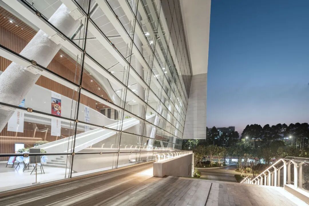 Open and Luxurious Literature. The Grand Theater is set on the waterfront side, open to the water. The Lobby is supported by V-shaped steel columns and covered by steel-ribbed tie rod plywood point glass curtain wall. Indoor public space, simple and elegant, integrates with a variety of commercial facilities and cultural and entertainment space, creating a light and luxurious cultural and artistic atmosphere.